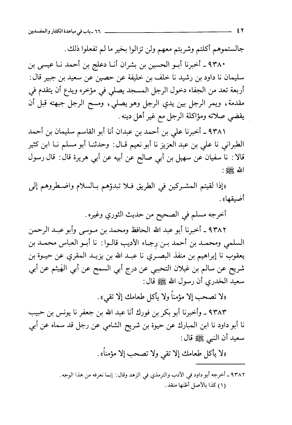 9383 - و أخبرنا أبو بكر بن فورك أنا عبد الله بن جعفر نا يونس بن حبيب نا أبو داود نا ابن المبارك عن حيوة بن شريح الشامي عن رجل قد سماه عن أبي سعيد : أن النبي صلى الله عليه و سلم قال : لا يأكل طعامك إلا تقي و لا تصحب إلا مؤمنا
