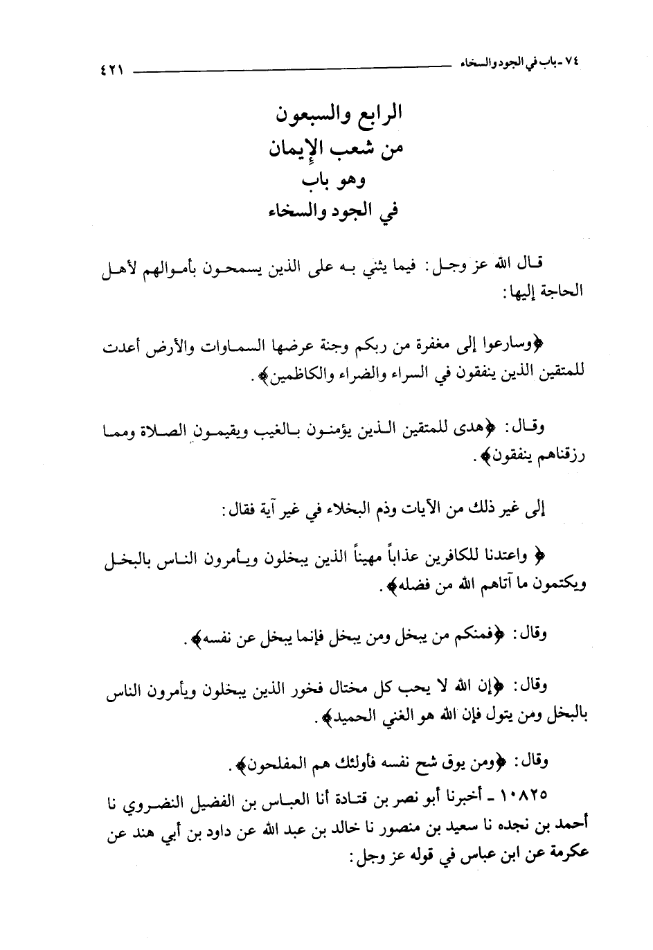 الرابع و السبعون من شعب الإيمان و هو باب في الجود و السخاء قال الله عز و جل : فيما يثني به على الذين يسمحون بأموالهم لأهل الحاجة إليها : { و سارعوا إلى مغفرة من ربكم و جنة عرضها السماوات و الأرض أعدت للمتقين * الذين ينفقون في السراء و الضراء و الكاظمين } و قال : { هدى للمتقين * الذين يؤمنون بالغيب و يقيمون الصلاة و مما رزقناهم ينفقون } إلى غير ذلك من الآيات و ذم البخلاء في غير آية فقال : { الذين يبخلون ويأمرون الناس بالبخل ويكتمون ما آتاهم الله من فضله وأعتدنا للكافرين عذابا مهينا } و قال : { فمنكم من يبخل و من يبخل فإنما يبخل عن نفسه } و قال : { والله لا يحب كل مختال فخور * الذين يبخلون ويأمرون الناس بالبخل ومن يتول فإن الله هو الغني الحميد } و قال : { و من يوق شح نفسه فأولئك هم المفلحون }