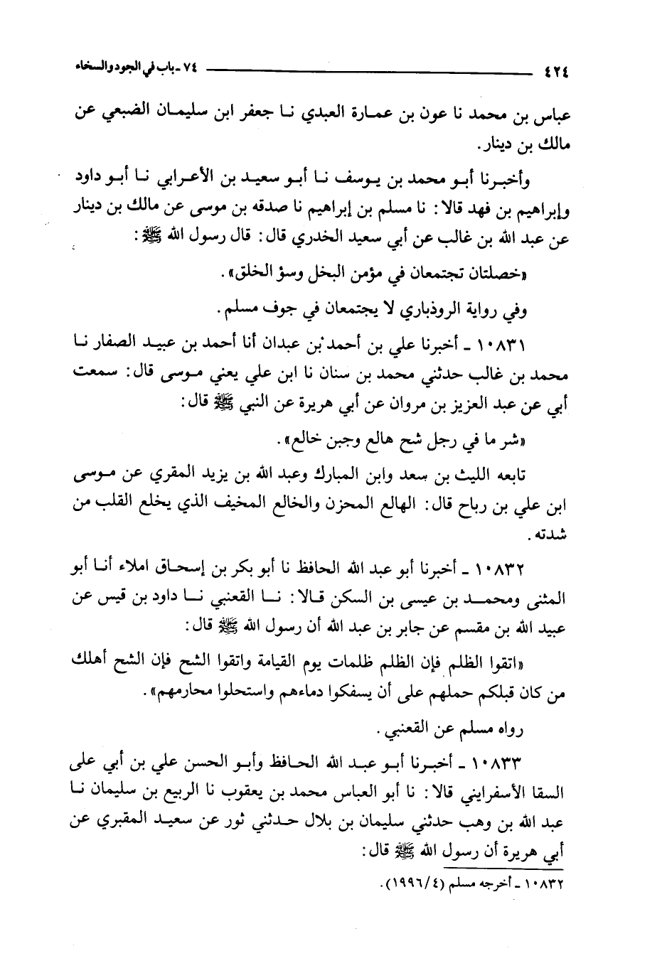 10833 - أخبرنا أبو عبد الله الحافظ و أبو الحسن علي بن أبي علي السقا الأسفرايني قالا : نا أبو العباس محمد بن يعقوب نا الربيع بن سليمان نا عبد الله بن وهب حدثني سليمان بن بلال حدثني ثور عن سعيد المقبري عن أبي هريرة : أن رسول الله صلى الله عليه و سلم قال : إياكم و الفحش فإن الله لا يحب الفاحش المتفحش و إياكم و الظلم فإنه عند الله ظلمة يوم القيامة و إياكم و الشح و البخل فإنه دعا من قبلكم إلى أن يقطعوا أرحامهم فقطعوها و دعاهم إلى أن يستحلوا محارمهم فاستحلوها و دعاهم إلى أن يسفكوا دماءهم فسفكوها