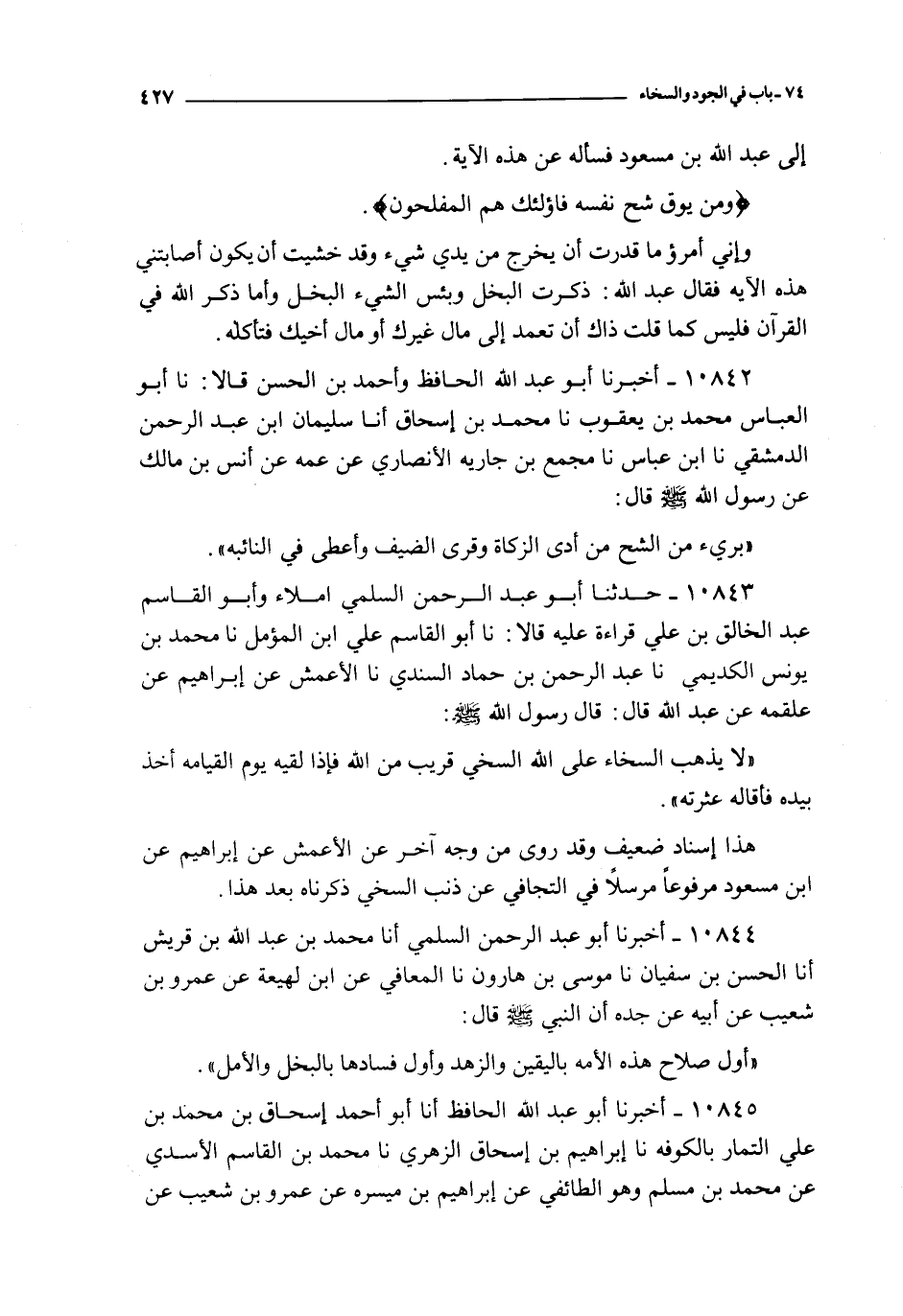 10843 - حدثنا أبو عبد الرحمن السلمي إملاء و أبو القاسم عبد الخالق بن علي قراءة عليه قالا : نا أبو القاسم علي ابن المؤمل نا محمد بن يونس الكديمي نا عبد الرحمن بن حماد السندي نا الأعمش عن إبراهيم عن علقمة عن عبد الله قال : قال رسول الله صلى الله عليه و سلم : لا يذهب السخاء على الله السخي قريب من الله فإذا لقيه يوم القيامة أخذ بيده فأقاله عثرته