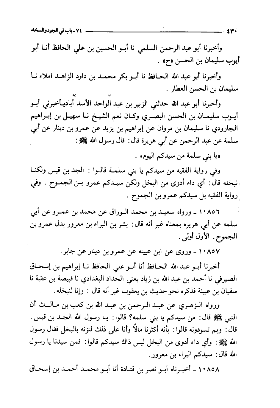 و رواه الزهري عن عبد الرحمن بن عبد الله بن كعب بن مالك أن النبي صلى الله عليه و سلم قال : من سيدكم يا بني سلمة ؟ قالوا : يا رسول الله الجد بن قيس قال : و بم تسودونه قالوا : بأنه أكثرنا مالا و إنا على ذلك لنزنه بالبخل فقال رسول الله صلى الله عليه و سلم : و أي داء أدوى من البخل ليس ذاك سيدكم قالوا : فمن سيدنا يا رسول الله قال : سيدكم البراء بن معرور