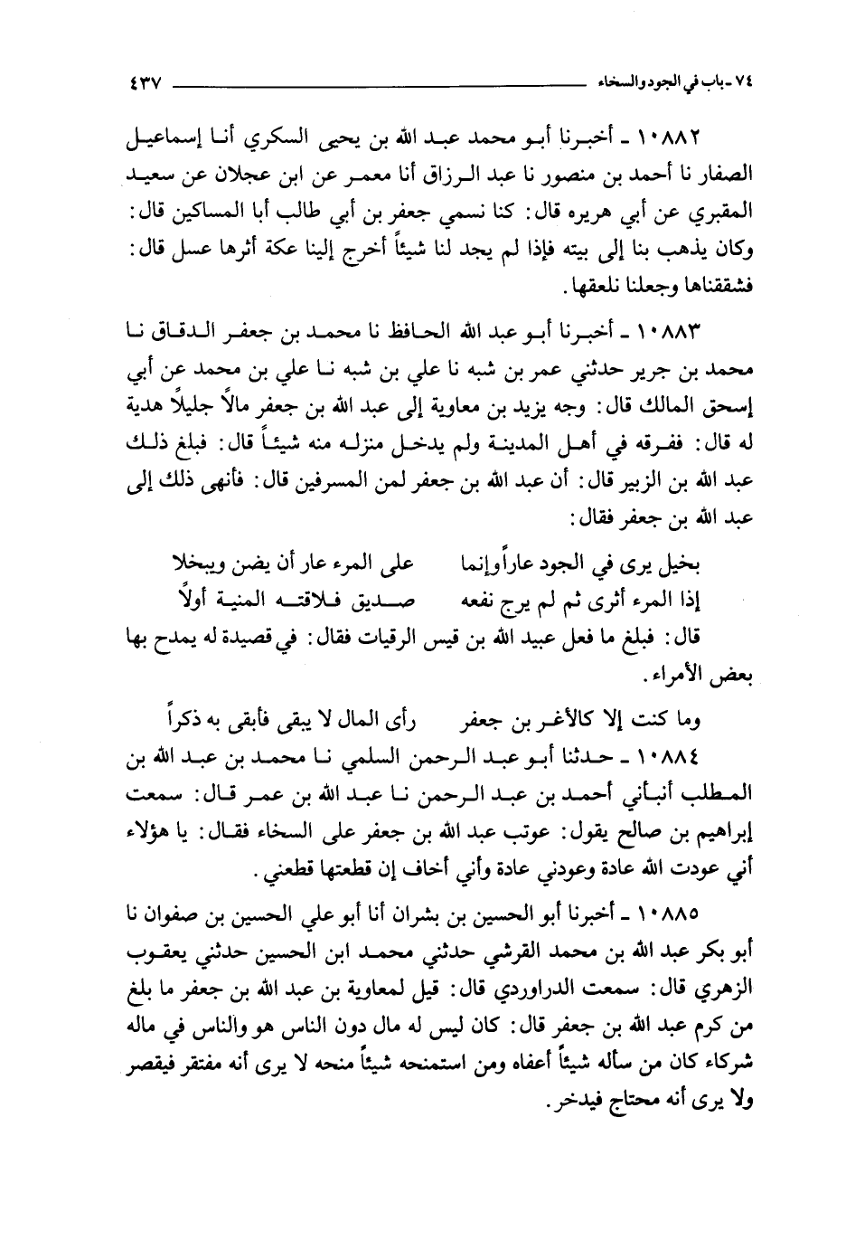 10885 - أخبرنا أبو الحسين بن بشران أنا أبو علي الحسين بن صفوان نا أبو بكر عبد الله بن محمد القرشي حدثني محمد بن الحسين حدثني يعقوب الزهري قال : سمعت الدراوردي قال : قيل لمعاوية بن عبد الله بن جعفر ما بلغ من كرم عبد الله بن جعفر قال : كان ليس له مال دون الناس هو و الناس في ماله شركاء كان من سأله شيئا أعفاه و من استمنحه شيئا منحه لا يرى أنه مفتقر فيقصر و لا يرى أنه محتاج فيدخر