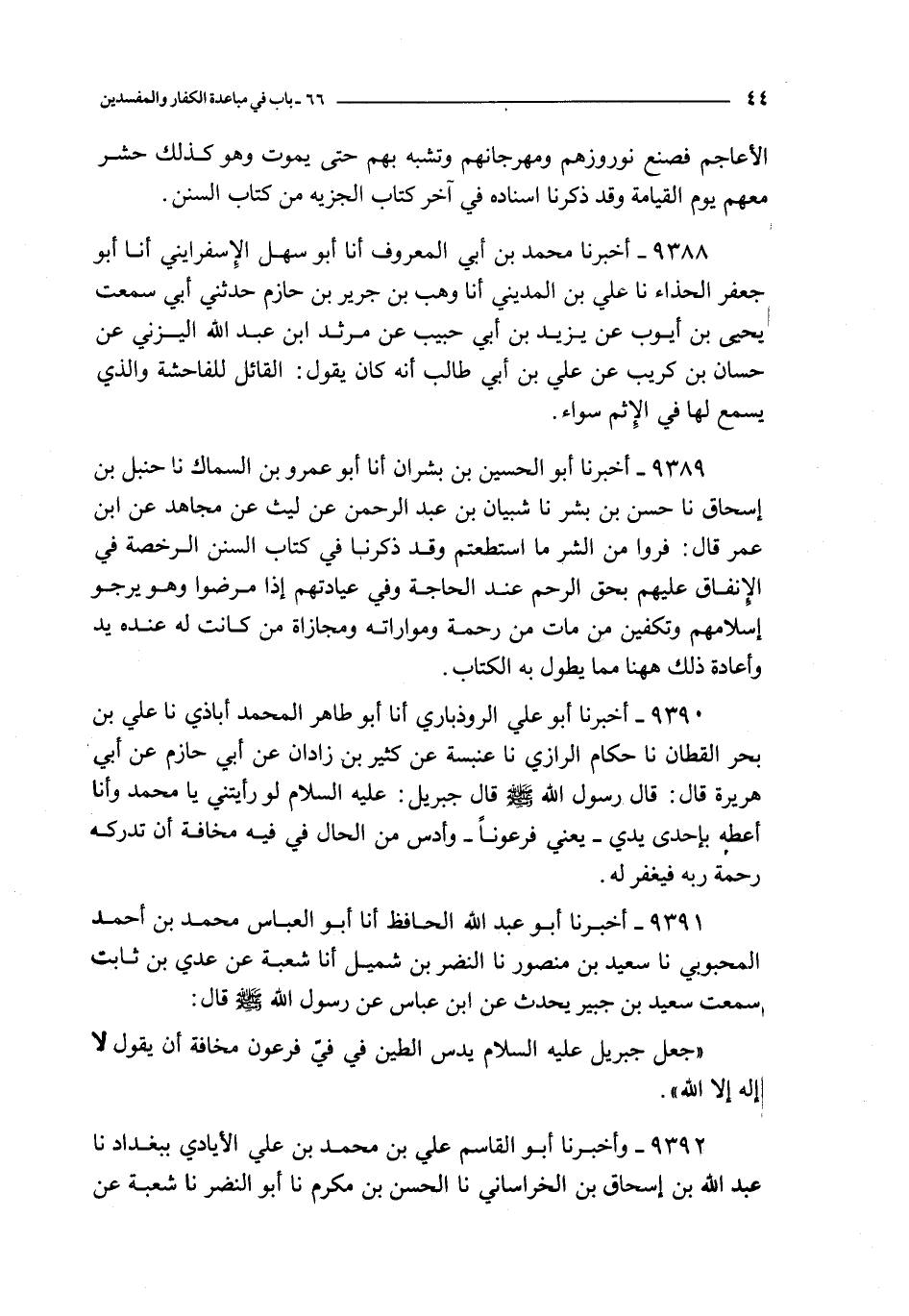 9390 - أخبرنا أبو علي الروذباري أنا أبو طاهر المحمد أباذي نا علي بن بحر القطان نا حكام الرازي نا عنبسة عن كثير بن زازان عن أبي حازم عن أبي هريرة قال : قال رسول الله صلى الله عليه و سلم قال جبريل : عليه السلام لو رأيتني يا محمد و أنا أعطه بإحدى يدي ـ يعني فرعونا ـ و أدس من الحال في فيه مخافة أن تدركه رحمة ربه فيغفر له