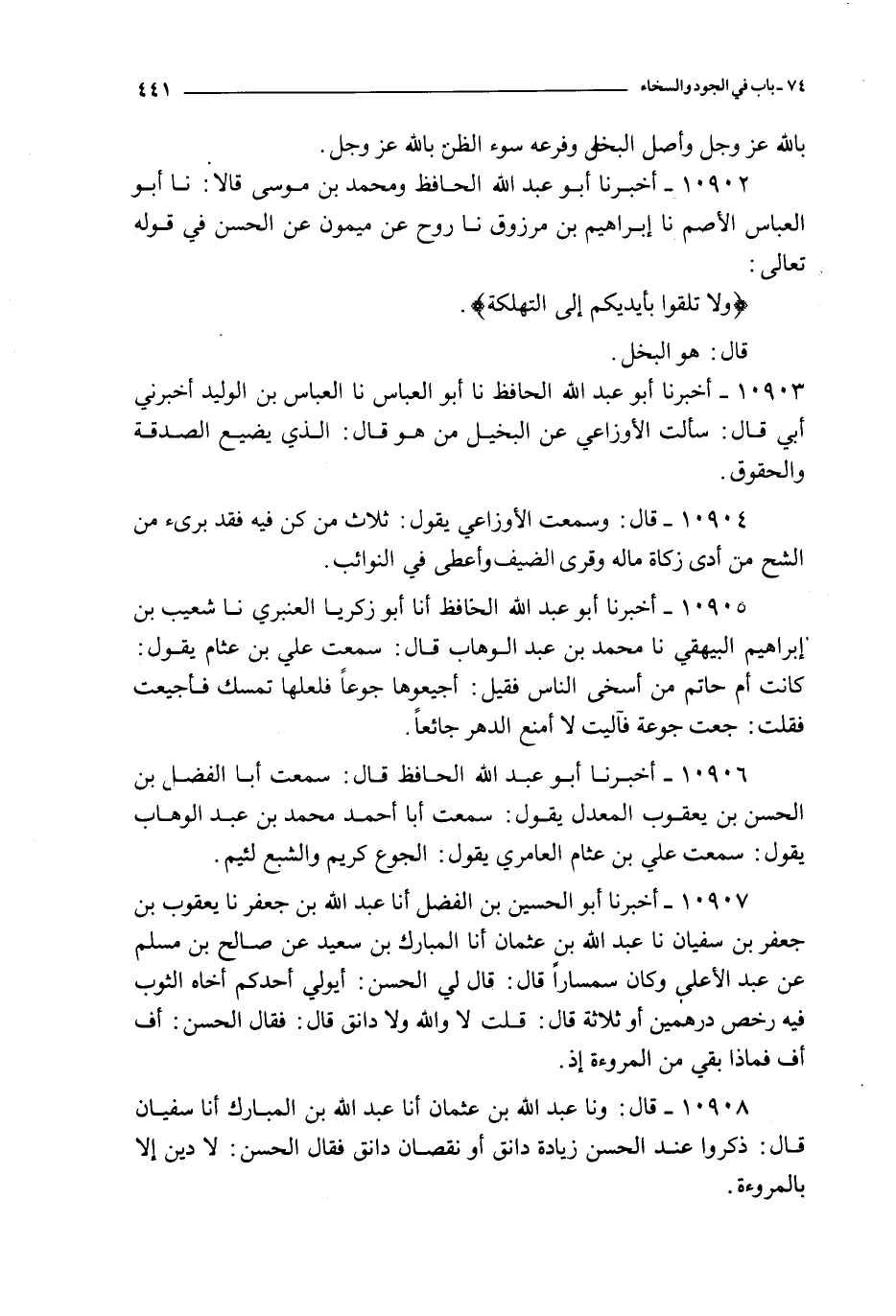 10903 - أخبرنا أبو عبد الله الحافظ نا أبو العباس نا العباس بن الوليد أخبرني أبي قال : سألت الأوزاعي عن البخيل من هو قال : الذي يضيع الصدقة و الحقوق