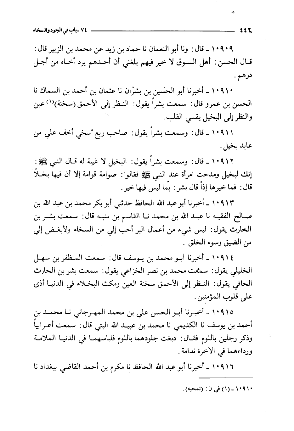10910 - أخبرنا أبو الحسين بن بشران نا عثمان بن أحمد بن السماك نا الحسن بن عمرو قال : سمعت بشرا يقول : النظر إلى الأحمق سخنة عين و النظر إلى البخيل يقسي القلب