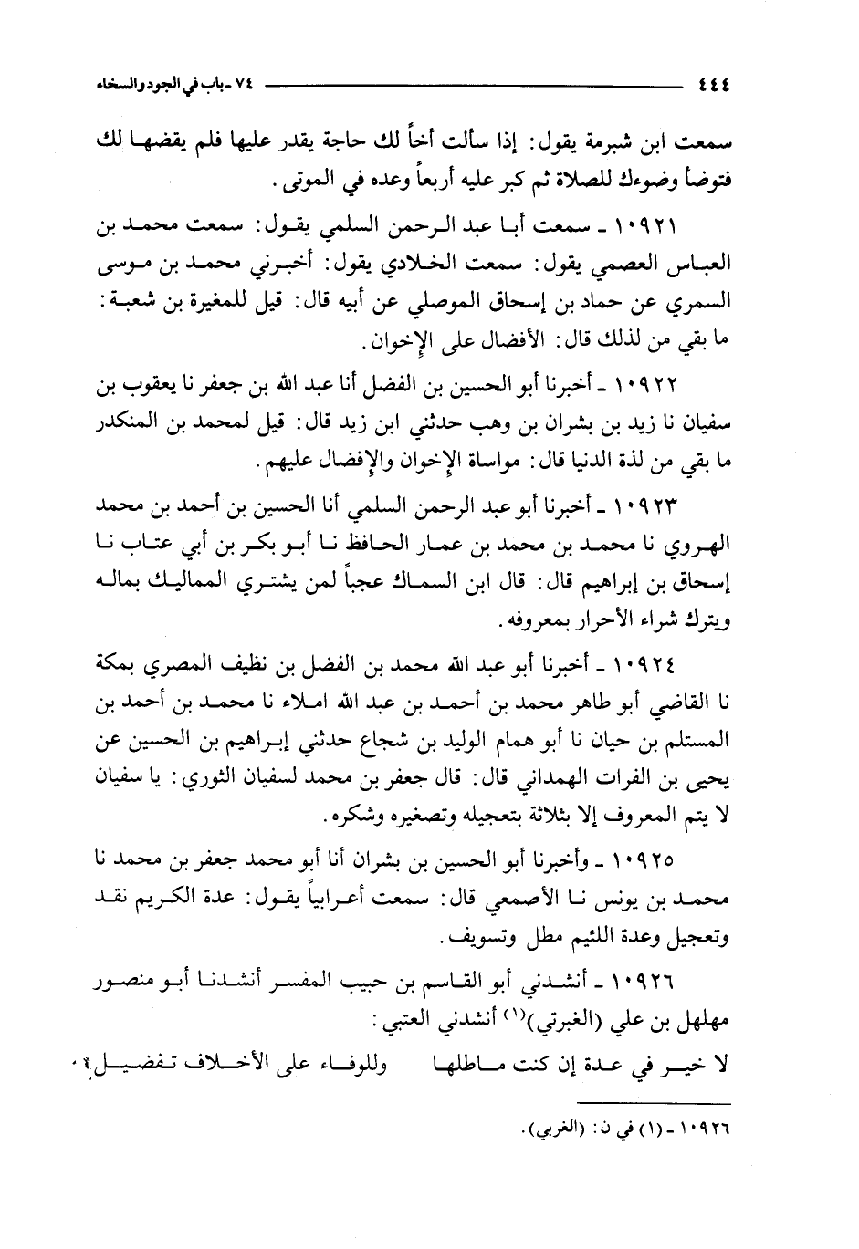 10921 - سمعت أبا عبد الرحمن السلمي يقول : سمعت محمد بن العباس العصمي يقول : سمعت الخلادي يقول : أخبرني محمد بن موسى السمري عن حماد بن إسحاق الموصلي عن أبيه قال : قيل للمغيرة بن شعبة : ما بقي من لذلك قال : الأفضال على الإخوان