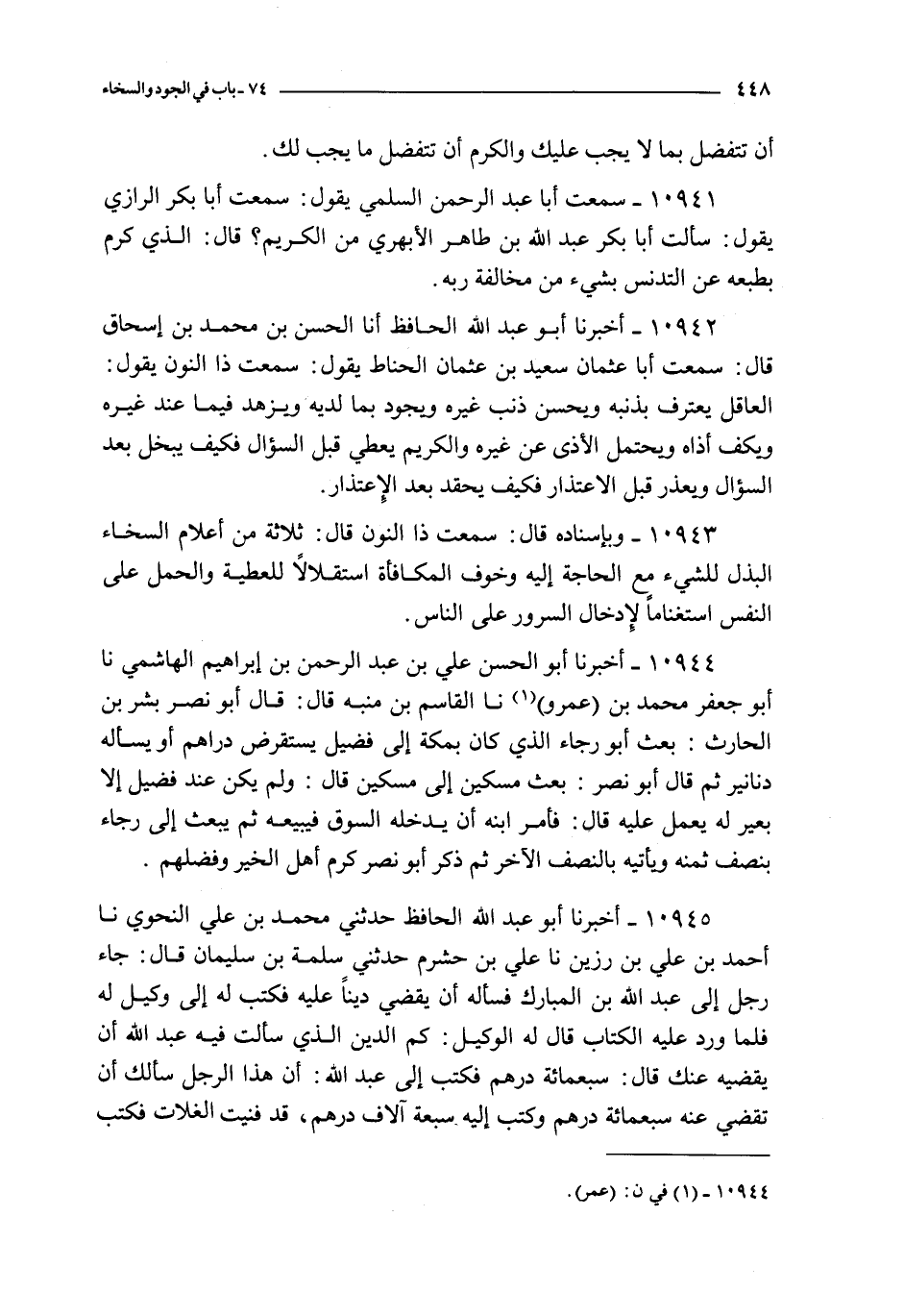 10943 - و بإسناده قال : سمعت ذا النون قال : ثلاثة من أعلام السخاء البذل للشيء مع الحاجة و خوف المكافأة استقلالا للعطية و الحمل على النفس استغناما لإدخال السرور على الناس