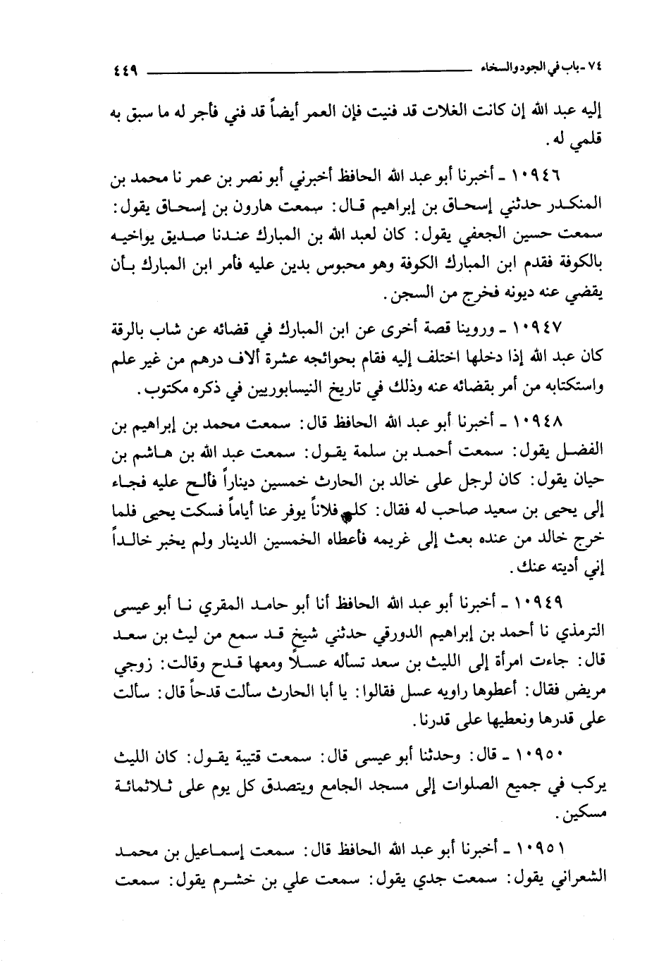 10950 - قال : و حدثنا أبو عيسى قال : سمعت قتيبة يقول : كان الليث يركب في جميع الصلوات إلى مسجد الجامع و يتصدق كل يوم على ثلاثمائة مسكين