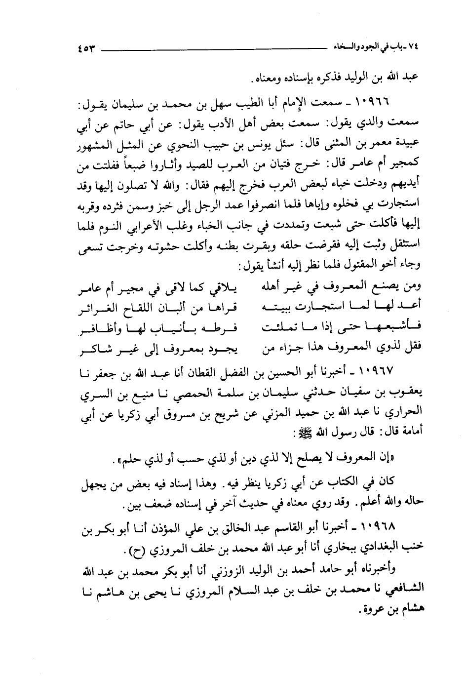 10967 - أخبرنا أبو الحسين بن الفضل القطان أنا عبد الله بن جعفر نا يعقوب بن سفيان حدثني سليمان بن سلمة الحمصي نا منيع بن السري الحراري نا عبد الله بن حميد المزني عن شريح بن مسروق أبي زكريا عن أبي أمامة قال : قال رسول الله صلى الله عليه و سلم : إن المعروف لا يصلح إلا لذي دين أو لذي حسب أو لذي حلم