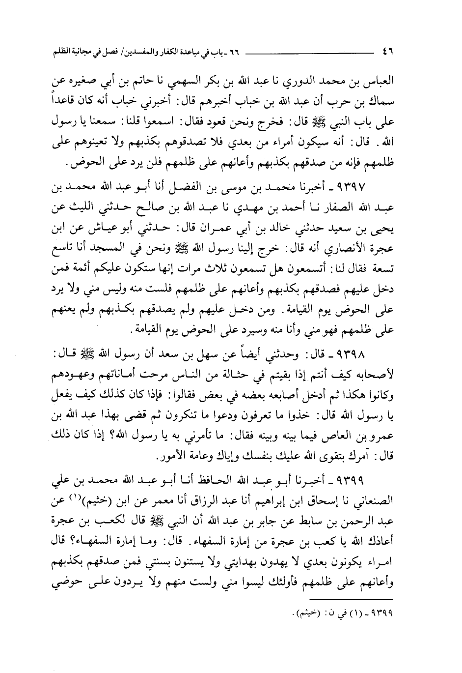 9397 - أخبرنا محمد بن موسى بن الفضل أنا عبد الله محمد بن عبد الله الصفار نا أحمد بن مهدي نا عبد الله بن صالح حدثني الليث عن يحيى بن سعيد حدثني خالد بن أبي عمرو قال : حدثني أبو عياش عن ابن عجرة الأنصاري أنه قال : خرج إلينا رسول الله صلى الله عليه و سلم و نحن في المسجد أنا تاسع تسعة فقال لنا : أتسمعون هل تسمعون ثلاث مرات إنها ستكون عليكم أئمة فمن دخل عليهم فصدقهم بكذبهم و أعانهم على ظلمهم فلست منه و ليس مني و لا يرد على الحوض يوم القيامة و من دخل عليهم و لم يصدقهم بكذبهم و لم يعنهم على ظلمهم فهو مني و أنا منه و سيرد على الحوض يوم القيامة