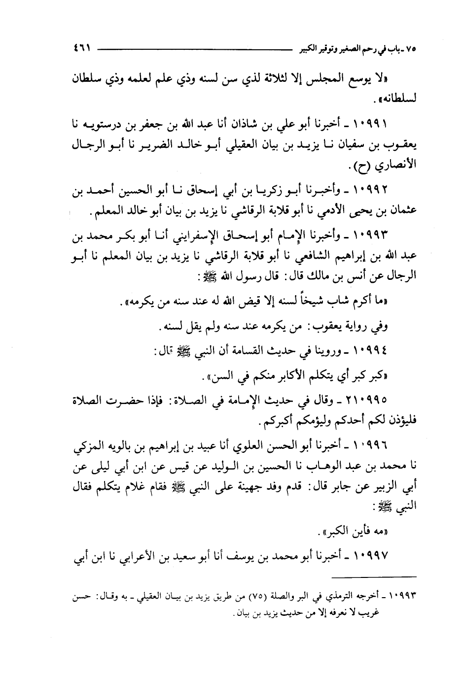 10993 - و أخبرنا الإمام أبو إسحاق الإسفرايني أنا أبو بكر محمد بن عبد الله بن إبراهيم الشافعي نا أبو قلابة الرقاشي نا يزيد بن بيان المعلم نا أبو الرجال عن أنس بن مالك قال : قال رسول الله صلى الله عليه و سلم : ما أكرم شاب شيخا لسنه إلا قيض الله له عند سنه من يكرمه