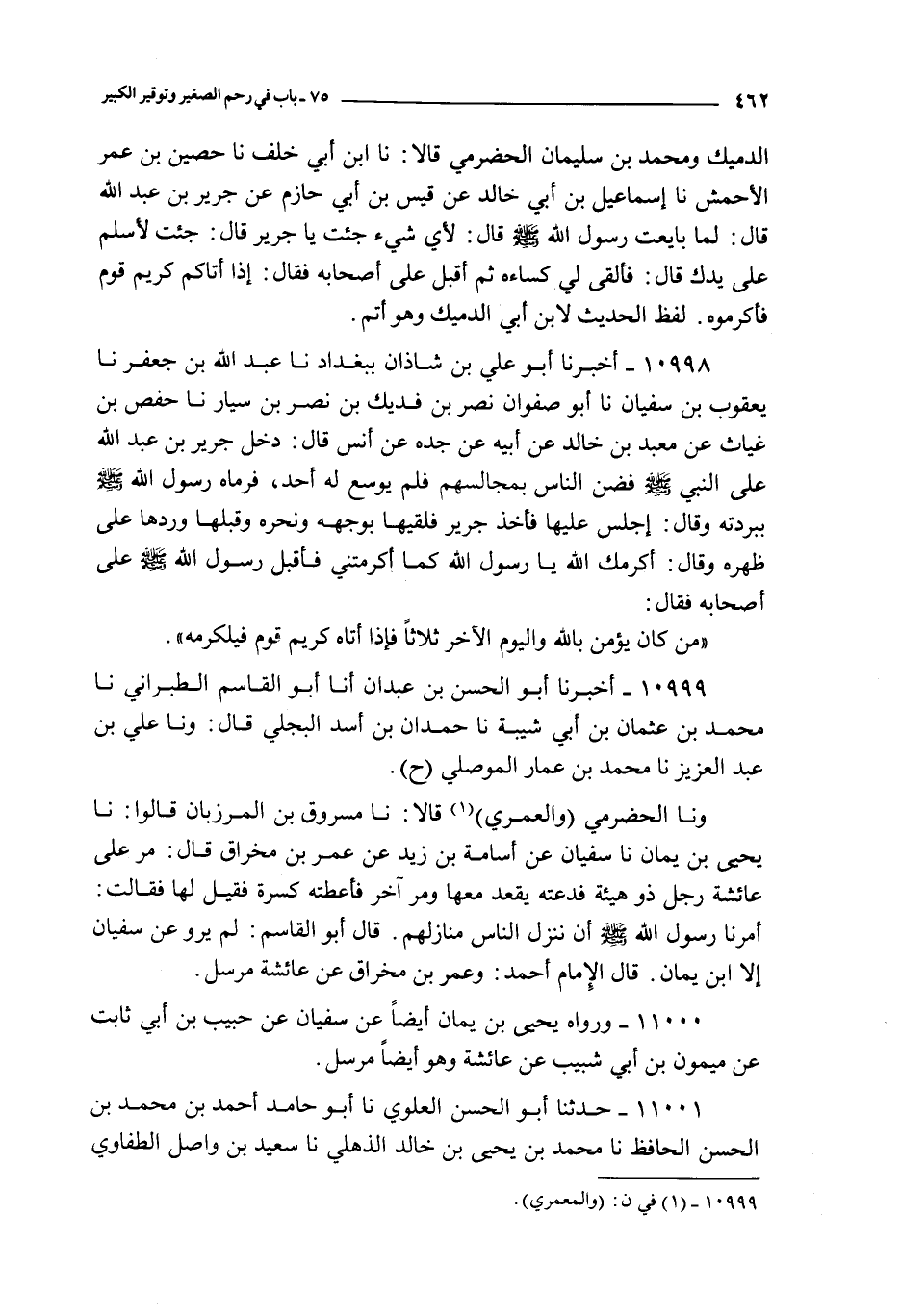 10998 - أخبرنا أبو علي بن شاذان ببغداد نا عبد الله بن جعفر نا يعقوب بن سفيان نا أبو صفوان نصر بن فديك الله نصر بن سيار نا حفص بن غياث عن معبد بن خالد عن أبيه عن جده عن أنس قال : دخل جرير بن عبد الله على النبي صلى الله عليه و سلم فضن الناس بمجالسهم فلم يوسع له أحد فرماه رسول الله صلى الله عليه و سلم ببردته و قال : اجلس عليها فأخذ جرير فلقيها بوجهه و نحره و قبلها و ردها على ظهره و قال : أكرمك الله يا رسول الله كما أكرمتني فأقبل رسول الله صلى الله عليه و سلم على أصحابه فقال : من كان يؤمن بالله و اليوم الآخر ثلاثا فإذا أتاه كريم قوم فليكرمه