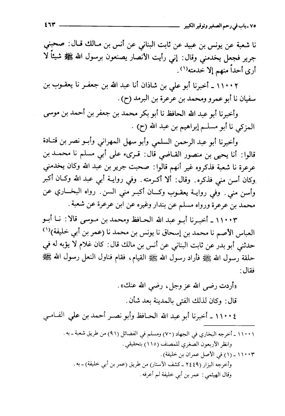 11003 - أخبرنا أبو عبد الله الحافظ و محمد بن موسى قالا : نا أبو العباس الأصم نا محمد بن إسحاق نا يونس بن محمد نا عمر بن أبي خليفة حدثني أبو بدر عن ثابت البناني عن أنس بن مالك قال : كان غلام لا يؤبه له في حلقة رسول الله صلى الله عليه و سلم فأراد رسول الله صلى الله عليه و سلم القيام فقام فناول النعل رسول الله صلى الله عليه و سلم فقال : أردت رضى الله عز و جل رضي الله عنك