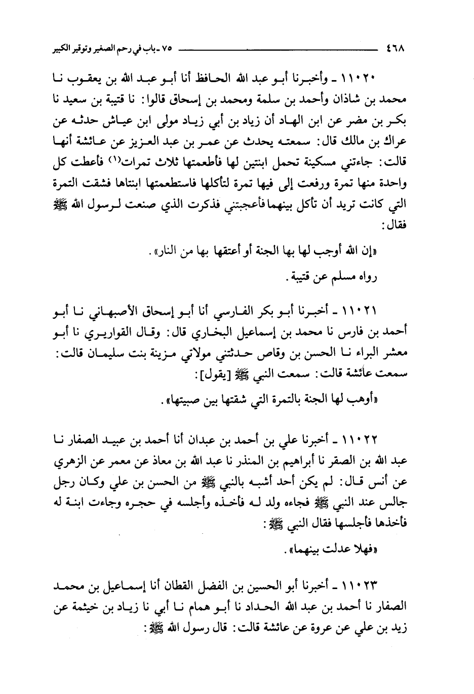 11020 - و أخبرنا أبو عبد الله الحافظ أنا أبو عبد الله بن يعقوب نا محمد بن شاذان و أحمد بن سلمة و محمد بن إسحاق قالوا : نا قتيبة بن سعيد نا بكر بن مضر عن ابن الهاد أن زياد بن أبي زياد مولى ابن عياش حدثه عن عراك بن مالك قال : سمعته يحدث عن عمر بن عبد العزيز عن عائشة أنها قالت : جاءتني مسكينة تحمل ابنتين لها فأطعمتها ثلاث تمرات فأعطت كل واحدة منها تمرة و رفعت إلى فيها تمرة لتأكلها فاستطعمتها ابنتاها فشقت التمرة التي كانت تريد أن تأكل بينهما فأعجبتني فذكرت الذي صنعت لرسول الله صلى الله عليه و سلم فقال : إن الله أوجب لها بها الجنة أو أعتقها بها من النار