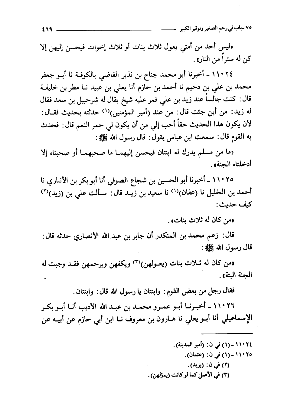 11024 - أخبرنا أبو محمد جناح بن نذير القاضي بالكوفة نا أبو جعفر محمد بن علي بن دحيم نا أحمد بن حازم أنا يعلى بن عبيد نا مطر بن خليفة قال : كنت جالسا عند زيد بن علي فمر عليه شيخ يقال له شرحبيل بن سعد فقال له زيد : من أين جئت قال : من عند أمير المؤمنين حدثته بحديث فقال : لأن يكون هذا الحديث حقا أحب إلي من أن يكون لي حمر النعم قال : فحدث به القوم قال : سمعت ابن عباس يقول : قال رسول الله صلى الله عليه و سلم ما من مسلم يدرك له ابنتان فيحسن إليهما ما صحبهما أو صحبتاه إلا أدخلتاه الجنة