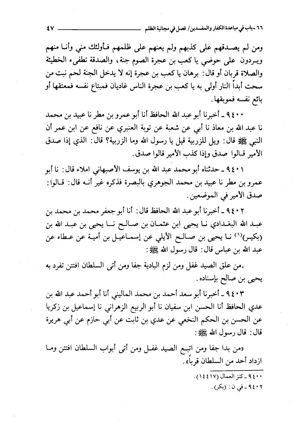 9402 - أخبرنا أبو عبد الله الحافظ قال : أنا أبو جعفر محمد بن محمد بن عبد الله البغدادي نا يحيى بن عثمان بن صالح نا يحيى بن عبد الله بن بكير نا يحيى بن صالح الأيلي عن إسماعيل بن أمية عن عطاء عن عبد الله بن عباس قال : قال رسول الله صلى الله عليه و سلم : من علق الصيد غفل و من لزم البادية جفا و من أتى السلطان افتتن تفرد به يحيى بن صالح بإسناده