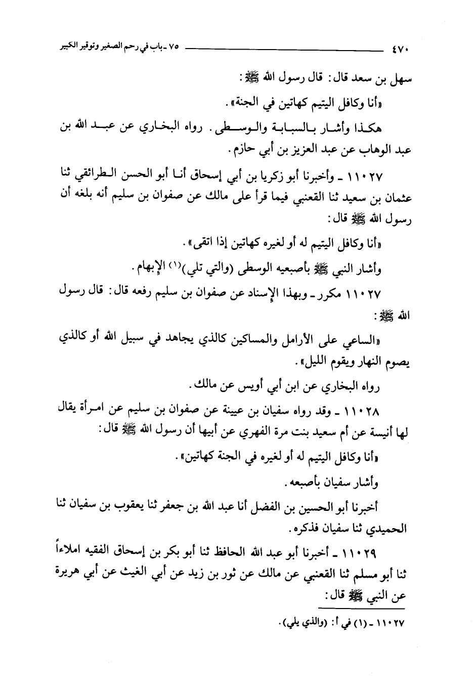11027 - و أخبرنا أبو زكريا بن أبي إسحاق أنا أبو الحسن الطرائقي ثنا عثمان بن سعيد ثنا القعنبي فيما قرأ على مالك عن صفوان بن سليم : أنه بلغه أن رسول الله صلى الله عليه و سلم قال : أنا و كافل اليتيم له أو لغيره كهاتين إذا اتقى