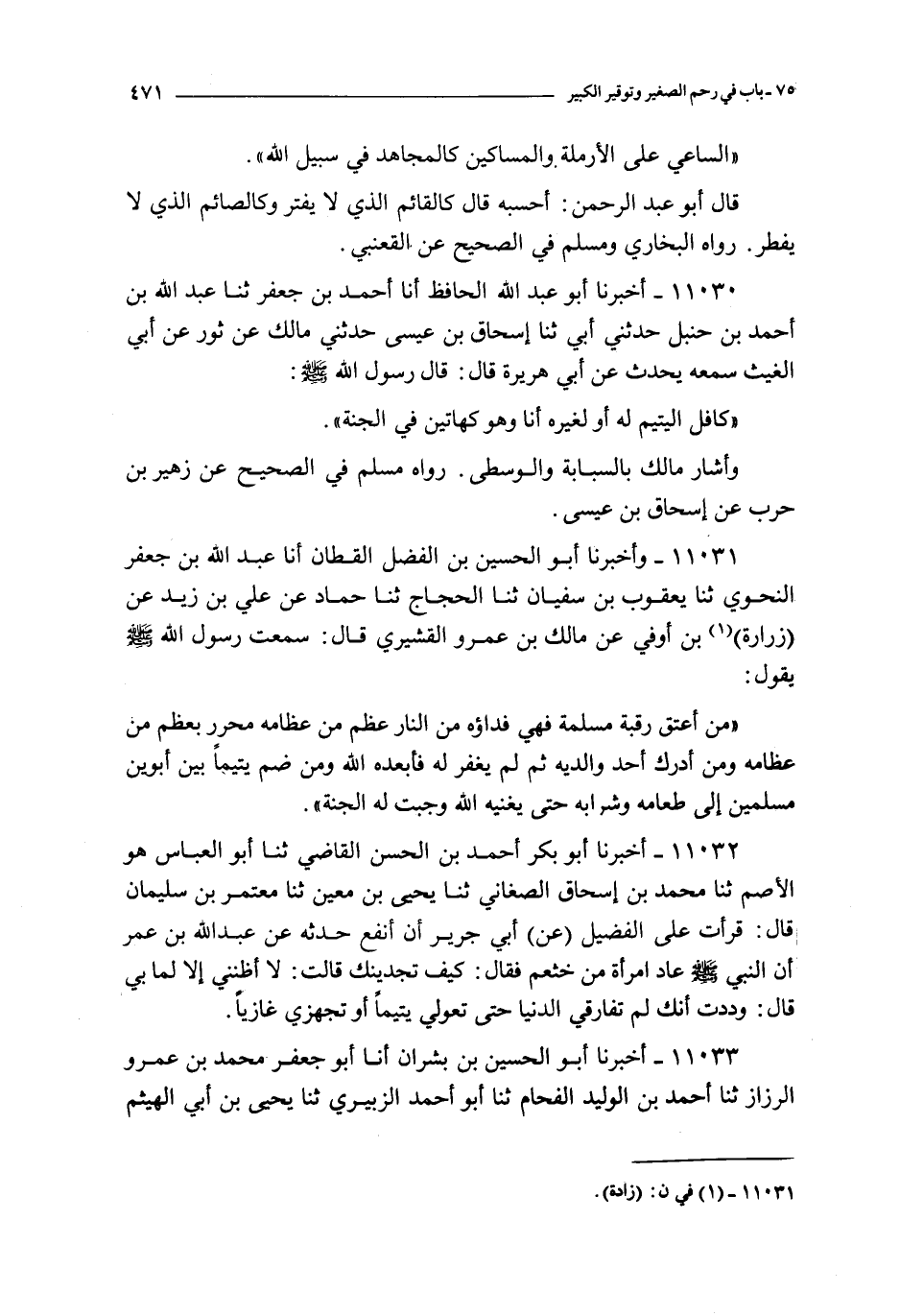 11031 - و أخبرنا أبو الحسين بن الفضل القطان أنا عبد الله بن جعفر النحوي ثنا يعقوب بن سفيان ثنا الحجاج ثنا حماد عن علي بن زيد عن زرارة بن أوفى عن مالك بن عمرو القشيري قال : سمعت رسول الله صلى الله عليه و سلم يقول : من أعتق رقبة مسلمة فهي فداؤه من النار عظم من عظامه محرر بعظم من عظامه و من أدرك أحد والديه ثم لم يغفر له فأبعده الله و من ضم يتيما بين أبوين مسلمين إلى طعامه و شرابه حتى يغنيه الله وجبت له الجنة