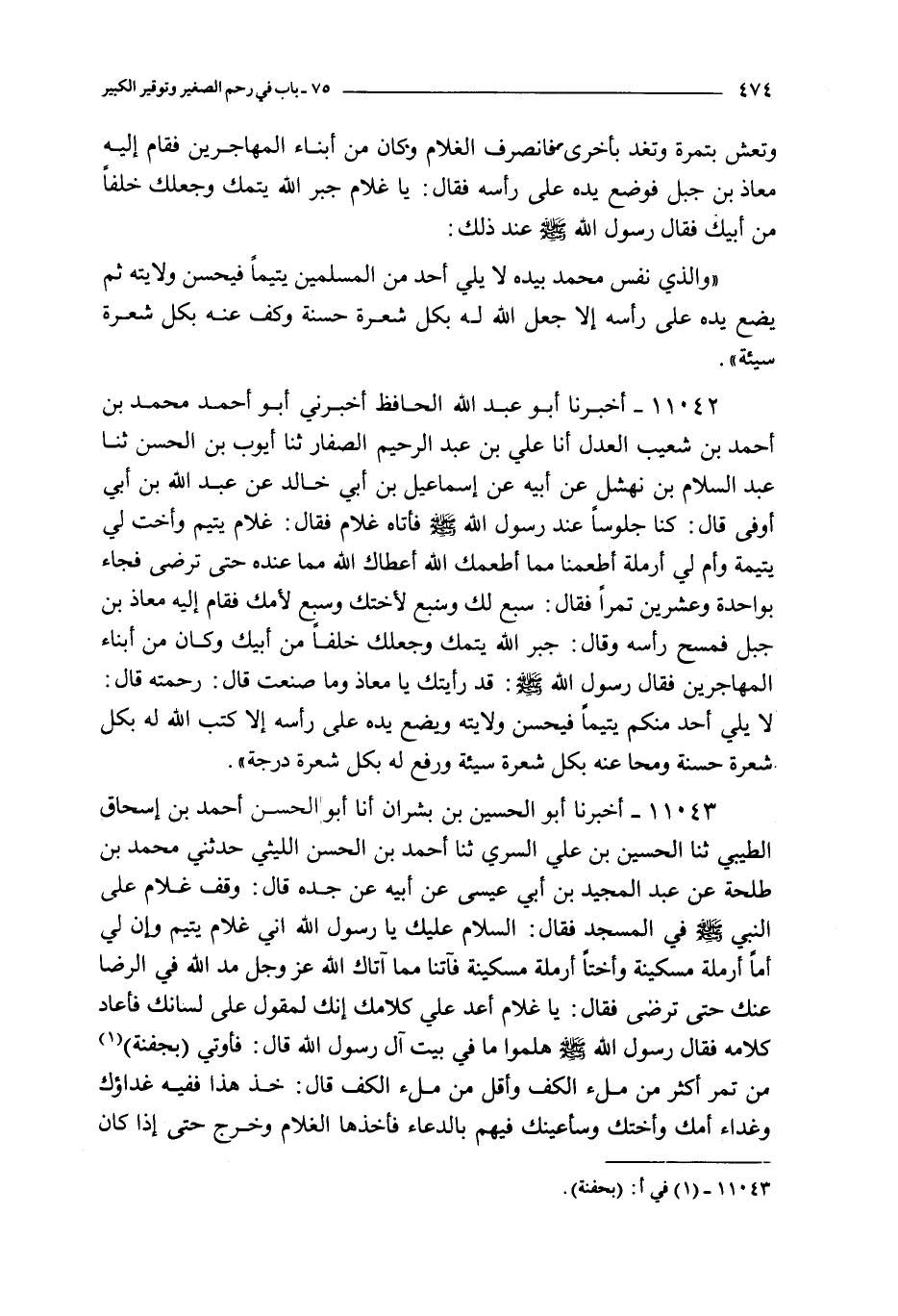 11042 - أخبرنا أبو عبد الله الحافظ أخبرني أبو أحمد محمد بن أحمد بن شعيب العدل أنا علي بن عبد الرحيم الصفار ثنا أيوب بن الحسن ثنا عبد السلام بن نهشل عن أبيه عن إسماعيل بن أبي خالد عن عبد الله بن أبي أوفى قال : كنا جلوسا عند رسول الله صلى الله عليه و سلم فأتاه غلام فقال : غلام يتيم و أخت لي يتيمة و أم لي أرملة أطعمنا مما أطعمك الله أعطاك الله مما عنده حتى ترضى فجاء بواحدة و عشرين تمرة فقال : سبع لك و سبع لأختك و سبع لأمك فقام إليه معاذ بن جبل فمسح رأسه و قال : جبر الله يتمك و جعلك خلفا من أبيك و كان من أبناء المهاجرين فقال رسول الله صلى الله عليه و سلم : قد رأيتك يا معاذ و ما صنعت قال : رحمته قال : لا يلي أحد منكم يتيما فيحسن ولايته و يضع يده على رأسه إلا كتب الله له بكل شعرة حسنة و محا عنه بكل شعرة سيئة و رفع له بكل شعرة درجة