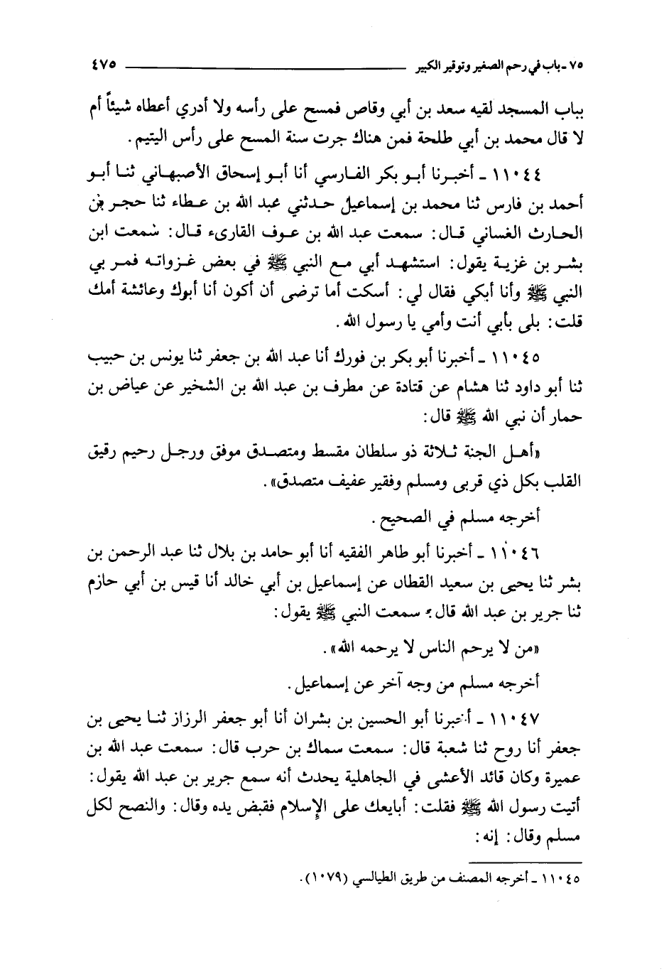 11046 - أخبرنا أبو طاهر الفقيه أنا أبو حامد بن بلال ثنا عبد الرحمن بن بشر ثنا يحيى بن سعيد القطان عن إسماعيل بن أبي خالد أنا قيس بن أبي حازم ثنا جرير بن عبد الله قال : سمعت النبي صلى الله عليه و سلم يقول : من لا يرحم الناس لا يC