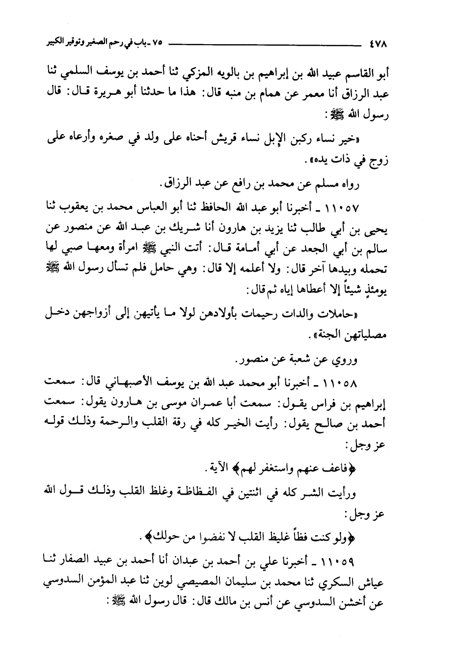 11058 - أخبرنا أبو محمد عبد الله بن يوسف الأصبهاني قال : سمعت إبراهيم بن فراس يقول : سمعت أبا عمران موسى بن هارون يقول : سمعت أحمد بن صالح يقول : رأيت الخير كله في رقة القلب و الرحمة و ذلك قوله عز و جل : { فاعف عنهم و استغفر لهم } الآية