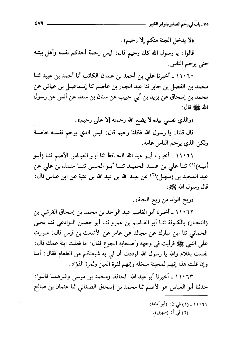 11060 - أخبرنا علي بن أحمد بن عبدان الكاتب أنا أحمد بن عبيد ثنا محمد بن الفضل بن جابر ثنا عبد الجبار بن عاصم ثنا إسماعيل بن عياش عن محمد بن إسحاق عن يزيد بن أبي حبيب عن سنان بن سعد عن أنس : عن رسول الله صلى الله عليه و سلم قال : و الذي نفسي بيده لا يضع الله رحمته إلا على رحيم قال قلنا : يا رسول الله فكلنا رحيم قال : ليس الذي يرحم نفسه خاصة و لكن الذي يرحم الناس عامة