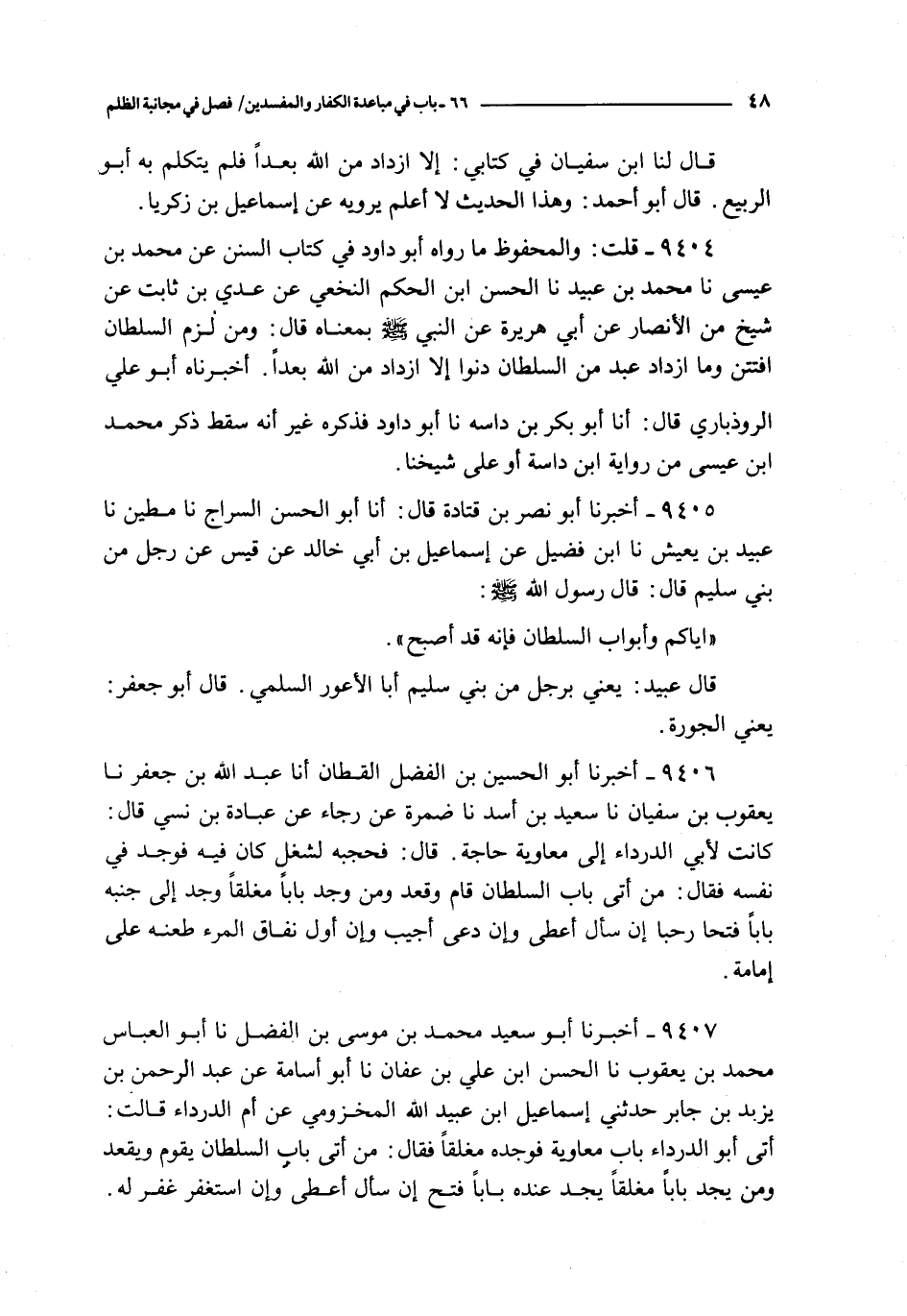 9404 - قلت : و المحفوظ ما رواه أبو داود في كتاب السنن عن محمد بن عيسى نا محمد بن عبيد نا الحسن بن الحكم النخعي عن عدي بن ثابت عن شيخ الأنصار عن أبي هريرة : عن النبي صلى الله عليه و سلم بمعناه قال : و من لزم السلطان افتتن و ما ازداد عبد من السلطان دنوا إلا ازداد من الله بعدا أخبرناه أبو علي الروذباري قال : أنا أبو بكر بن داسة نا أبو داود فذكره غير أنه سقط ذكر محمد بن عيسى من رواية ابن داسة أو على شيخنا