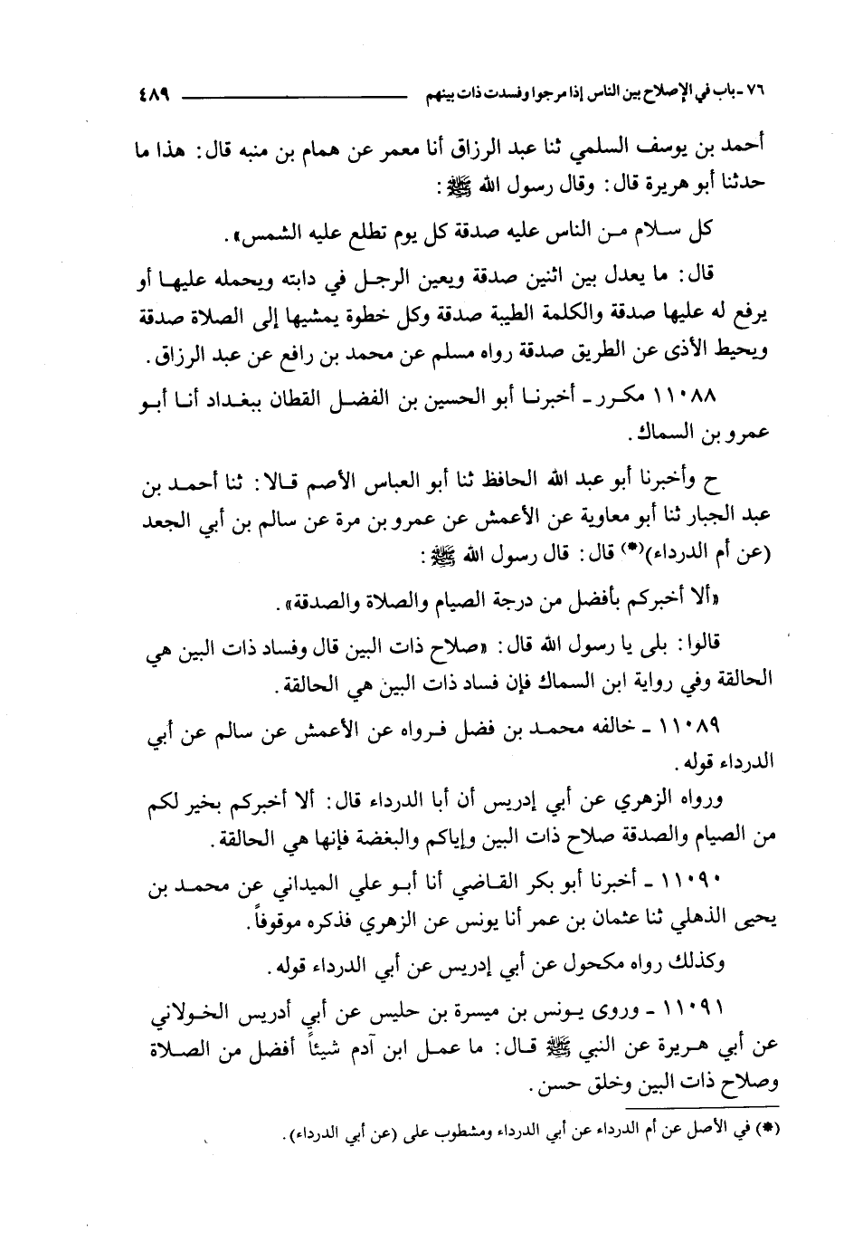 11091 - و روى يونس بن ميسرة بن حليس عن أبي إدريس الخولاني عن أبي هريرة : عن النبي صلى الله عليه و سلم قال : ما عمل ابن آدم شيئا أفضل من الصلاة و صلاح ذات البين و خلق حسن أخبرناه أبو بكر الفارسي أنا أبو إسحاق الأصبهاني ثنا أبو أحمد بن فارس ثنا محمد بن إسماعيل البخاري ثنا سليمان بن عبد الرحمن ثنا محمد بن حجاج ثنا يونس بن ميسرة بن حليس فذكره