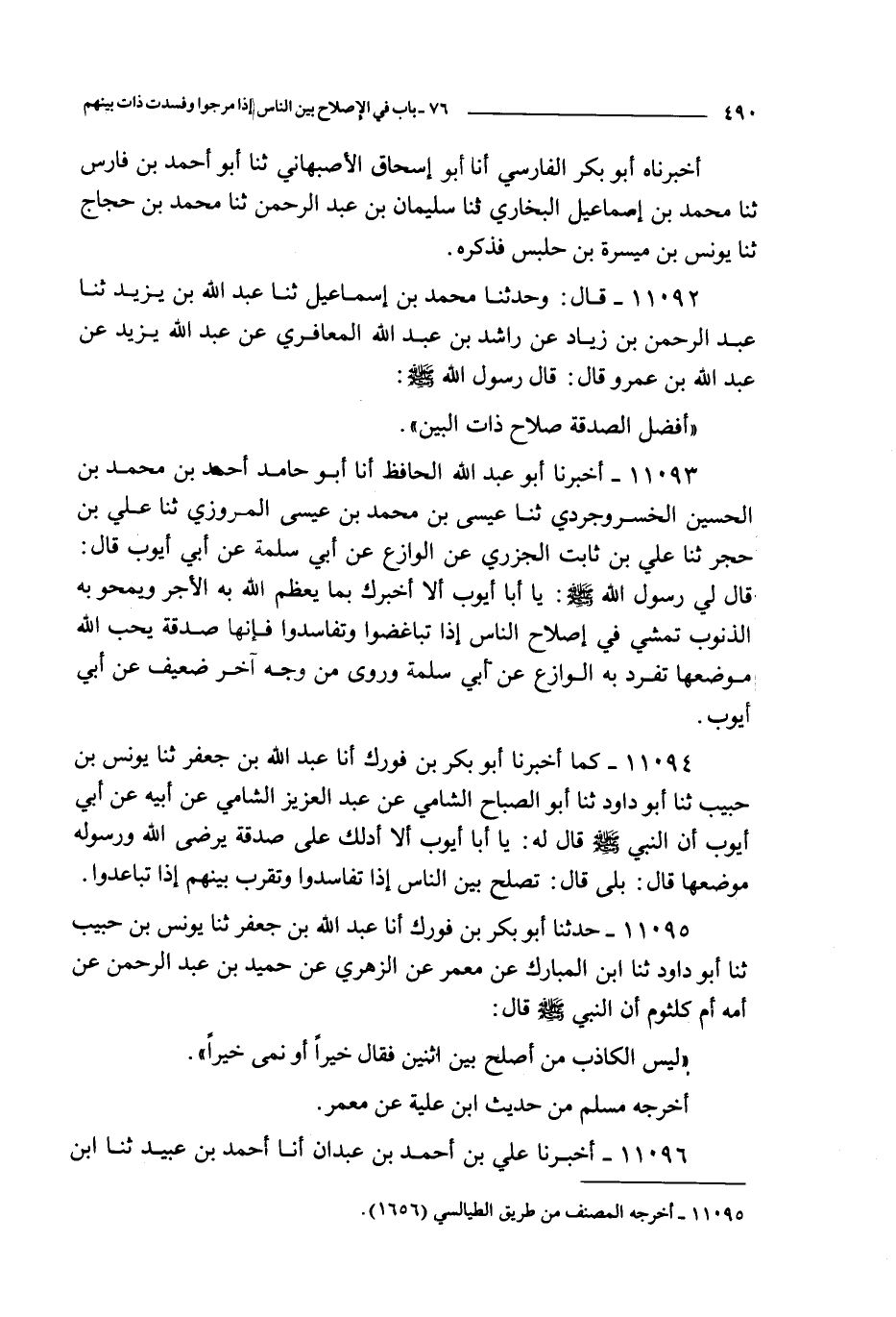 11094 - كما أخبرنا أبو بكر بن فورك أنا عبد الله بن جعفر ثنا يونس بن حبيب ثنا أبو داود ثنا أبو الصباح الشامي عن عبد العزيز الشامي عن أبيه عن أبي أيوب : أن النبي صلى الله عليه و سلم قال له : يا أبا أيوب ألا أدلك على صدقة يرضى الله و رسوله موضعها قال : بلى قال : تصلح بين الناس إذا تفاسدوا و تقرب بينهم إذا تباعدوا