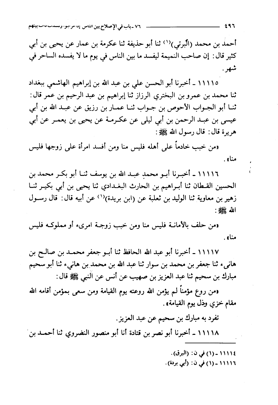 11116 - أخبرنا أبو محمد عبد الله بن يوسف ثنا أبو بكر محمد بن الحسين القطان ثنا إبراهيم بن الحارث البغدادي ثنا يحيى بن أبي بكير ثنا زهير بن معاوية ثنا الوليد بن ثعلبة عن ابن بريدة عن أبيه قال : قال رسول الله صلى الله عليه و سلم : من حلف بالأمانة فليس منا و من خبب زوجة امرىء أو مملوكه فليس منا