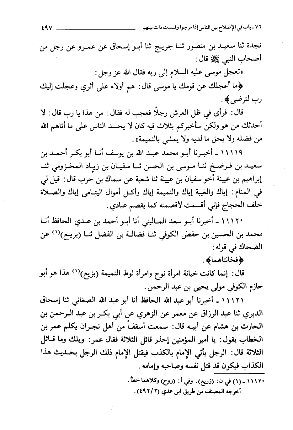 11121 - أخبرنا أبو عبد الله الحافظ أنا أبو عبد الله الصغاني ثنا إسحاق الدبري ثنا عبد الرزاق عن معمر عن الزهري عن أبي بكر بن عبد الرحمن بن الحارث بن هشام عن أبيه قال : سمعت أسقفا من أهل نجران يكلم عمر بن الخطاب يقول : يا أمير المؤمنين إحذر قائل الثلاثة فقال عمر : ويلك و ما قائل الثلاثة قال : الرجل يأتي الإمام بالكذب فيقتل الإمام ذلك الرجل بحديث هذا الكذاب فيكون قد قتل نفسه و صاحبه و إمامه