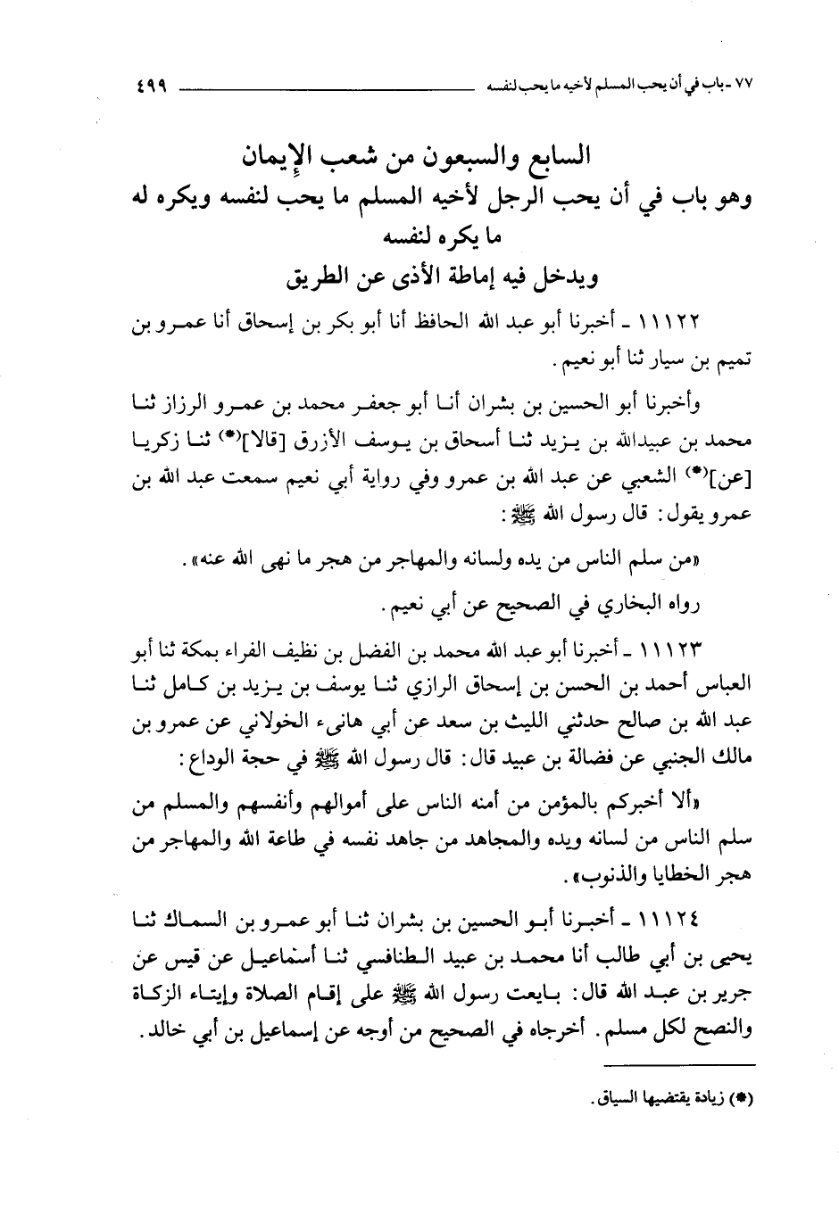 السابع و السبعون من شعب الإيمان و هو باب في أن يحب الرجل لأخيه المسلم ما يحب لنفسه و يكره له ما يكره لنفسه و يدخل فيه إماطة الأذى عن الطريق