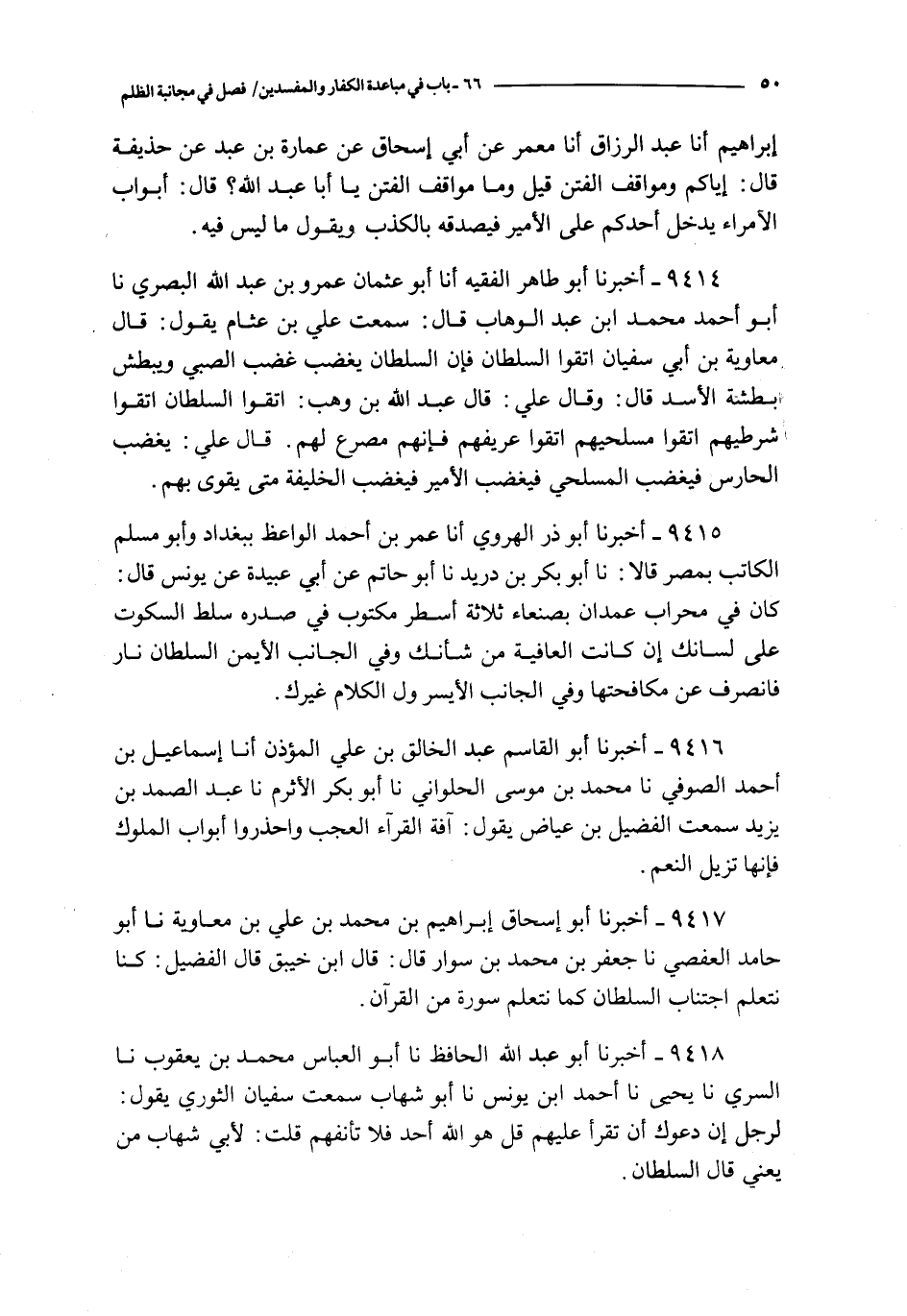 9417 - أخبرنا أبو إسحاق إبراهيم بن محمد بن علي بن معاوية نا أبو حامد العفصي نا جعفر بن محمد بن سوار قال : قال ابن خيبق قال الفضيل : كنا نتعلم اجتناب السلطان كما نتعلم سورة من القرآن