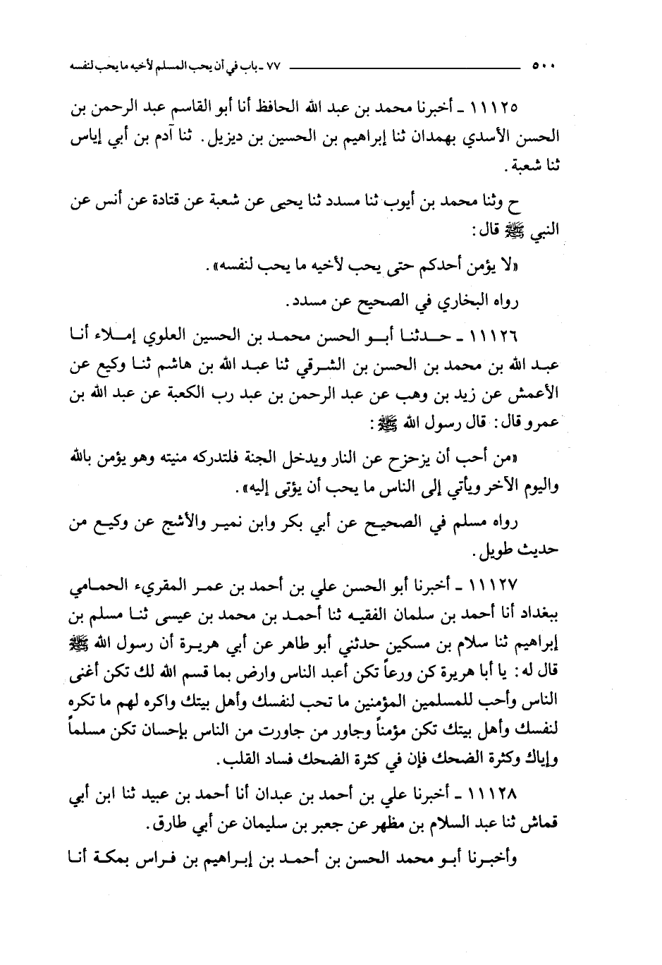 11126 - حدثنا أبو الحسن محمد بن الحسين العلوي إملاء أنا عبد الله بن محمد بن الحسن بن الشرقي ثنا عبد الله بن هاشم ثنا وكيع عن الأعمش عن زيد بن وهب عن عبد الرحمن بن عبد رسول الله الكعبة عن عبد الله بن عمرو قال : قال رسول الله صلى الله عليه و سلم : من أحب أن يزحزح عن النار و يدخل الجنة فلتدركه منيته و هو يؤمن بالله و اليوم الآخر و يأتي إلى الناس ما يحب أن يؤتى إليه