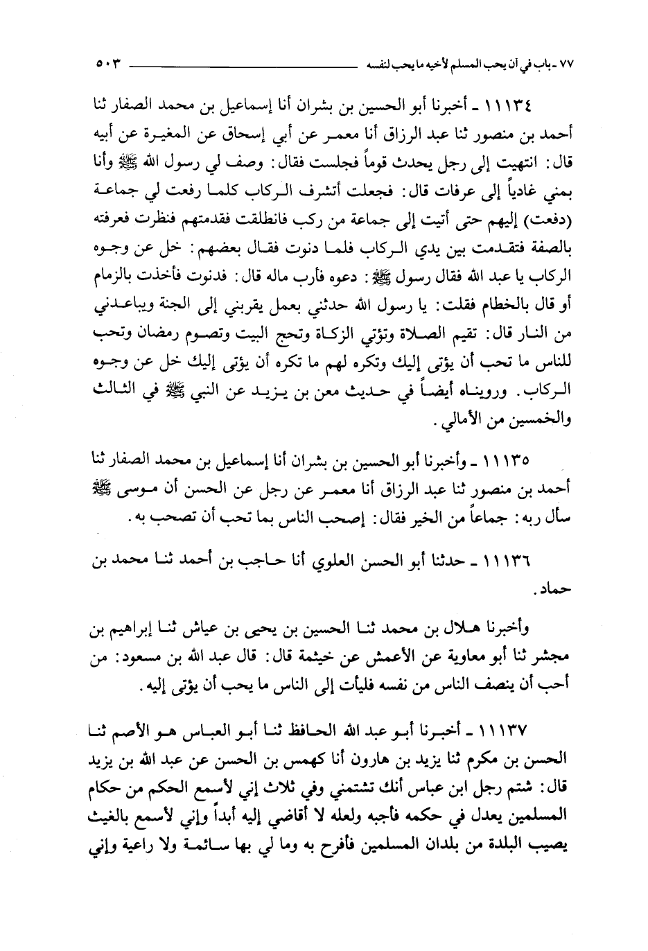 11134 - أخبرنا أبو الحسين بن بشران أنا إسماعيل بن محمد الصفار ثنا أحمد بن منصور ثنا عبد الرزاق أنا معمر عن أبي إسحاق عن المغيرة عن أبيه قال : انتهيت إلى رجل يحدث قوما فقال : وصف لي رسول الله صلى الله عليه و سلم و أنا بمنى غاديا إلى عرفات قال : فجعلت أتشرف الركاب كلما رفعت لي جماعة دفعت إليهم حتى أتيت إلى جماعة من ركب فانطلقت فقدمتهم فنظرت فعرفته بالصفة فتقدمت بين يدي الركاب فلما دنوت فقال بعضهم : خل عن وجوه الركاب يا عبد الله فقال رسول الله صلى الله عليه و سلم : دعوه فأرب ماله قال : فدنوت فأخذت بالزمام أو قال بالخطام فقلت : يا رسول الله حدثني بعمل يقربني إلى الجنة ويباعدني من النار قال : تقيم الصلاة و تؤتي الزكاة و تحج البيت و تصوم رمضان و تحب للناس ما تحب أن يؤتى إليك و تكره لهم ما تكره أن يؤتى إليك خل عن وجوه الركاب