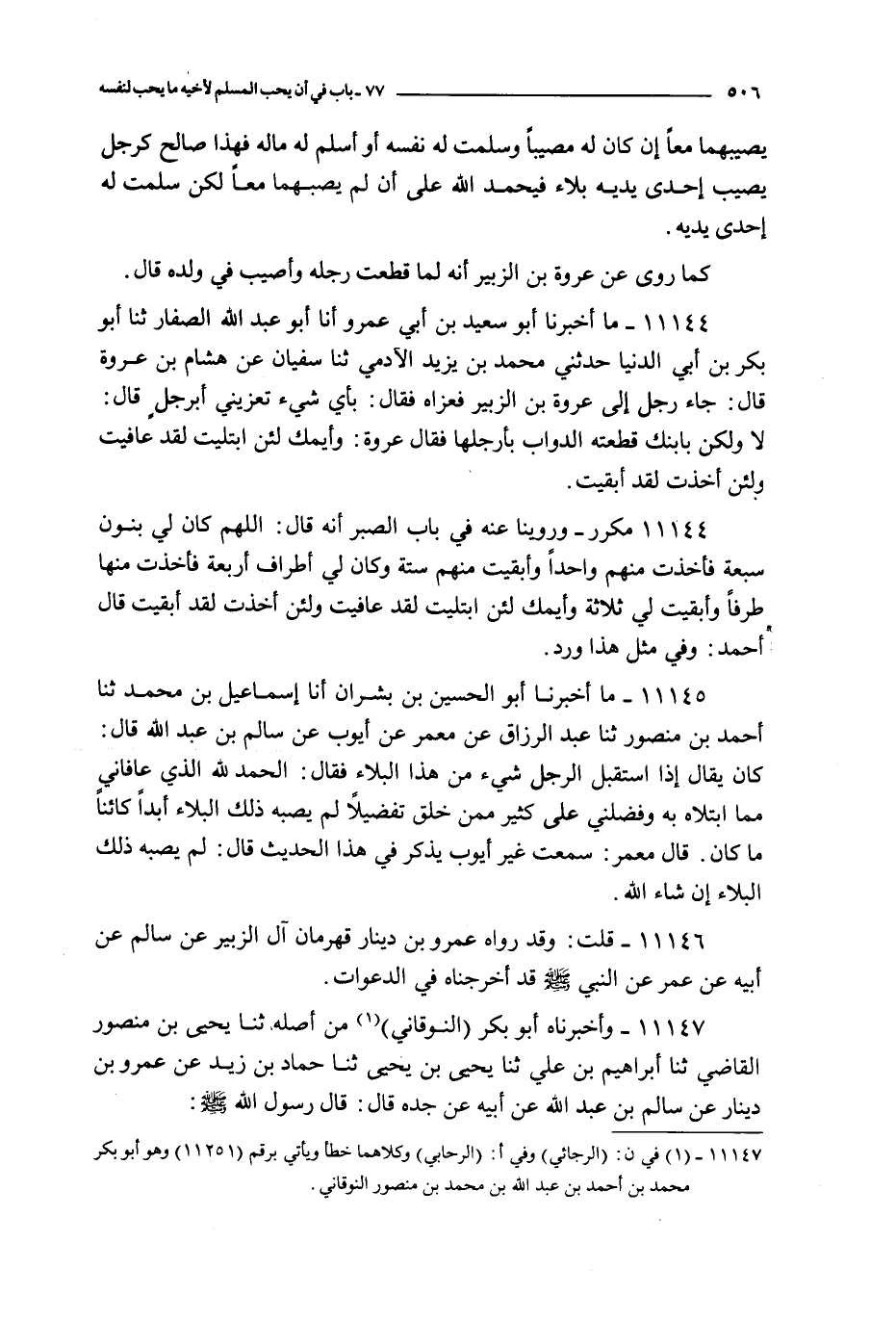 11147 - و أخبرناه أبو بكر النوقاني من أصله ثنا يحيى بن منصور القاضي ثنا إبراهيم بن علي ثنا يحيى بن يحيى ثنا حماد بن زيد عن عمرو بن دينار عن سالم بن عبد الله عن أبيه عن جده قال : قال رسول الله صلى الله عليه و سلم : ما من رجل يرى رجلا به بلاء فقال : الحمد لله الذي عافاني مما ابتلاه به و فضلني على كثير ممن خلق تفضيلا إلا لم يصبه ذلك البلاء كائنا ما كان