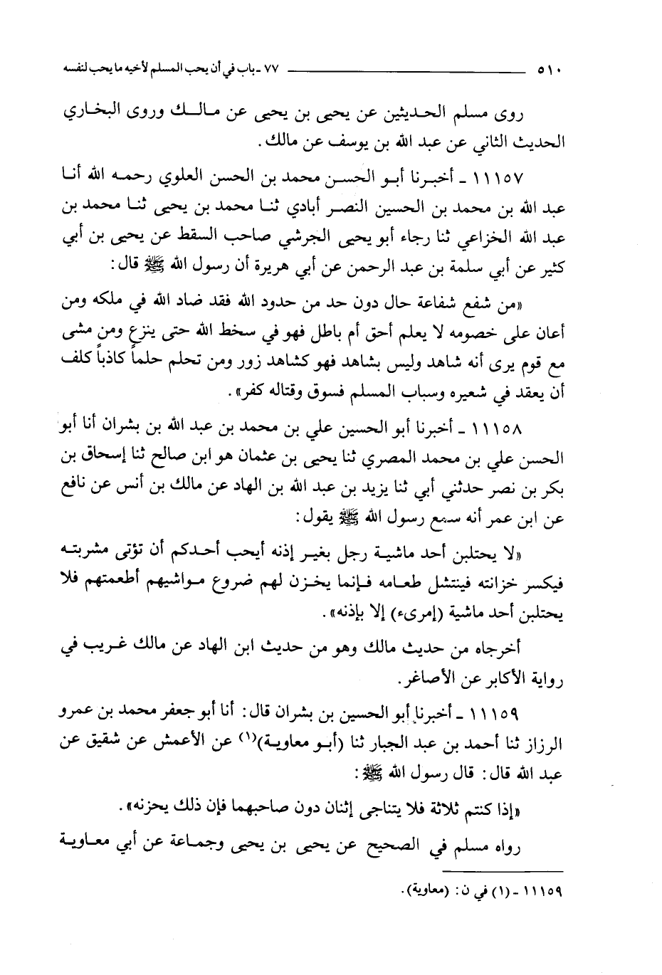 11159 - أخبرنا أبو الحسين بن بشران قال : أنا أبو جعفر محمد بن عمرو الرزاز ثنا أحمد بن عبد الجبار ثنا أبو معاوية عن الأعمش عن شقيق عن عبد الله قال : قال رسول الله صلى الله عليه و سلم : إذا كنتم ثلاثة فلا يتناجى اثنان دون صاحبهما فإن ذلك يحزنه
