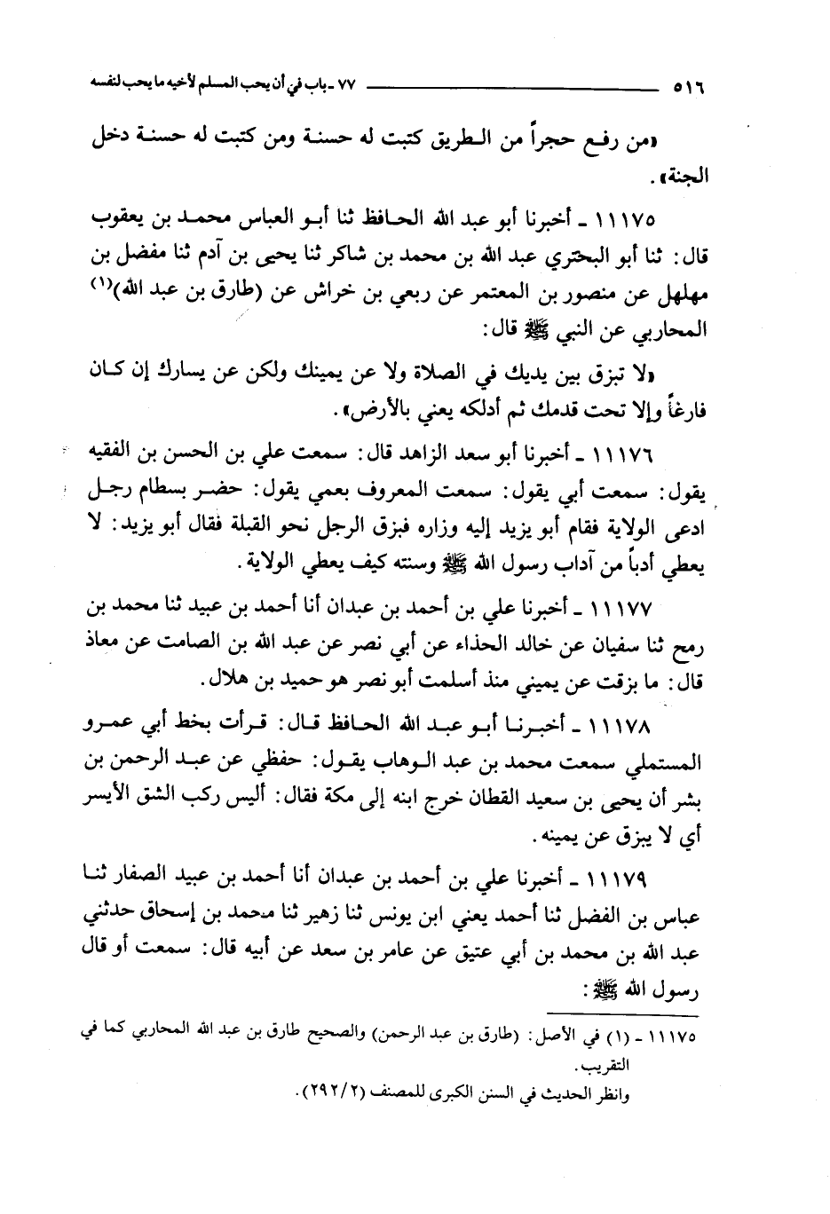 11175 - أخبرنا أبو عبد الله الحافظ ثنا أبو العباس محمد بن يعقوب قال : ثنا أبو البحتري عبد الله بن محمد بن شاكر ثنا يحيى بن آدم ثنا مفضل بن مهلهل عن منصور بن المعتمر عن ربعي بن خراش عن طارق بن عبد الله المحاربي : عن النبي صلى الله عليه و سلم قال : لا تبزق بين يديك في الصلاة و لا عن يمينك و لكن عن يسارك إن كان فارغا و إلا تحت قدمك ثم أدلكه يعني بالأرض