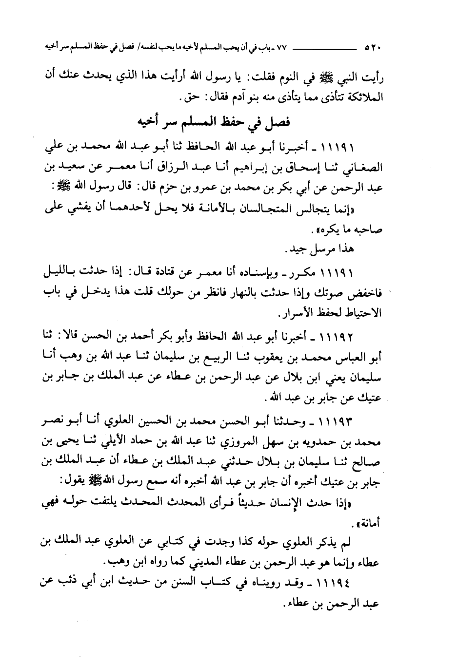 11191 - أخبرنا أبو عبد الله الحافظ ثنا أبو عبد الله محمد بن علي الصغاني ثنا إسحاق بن إبراهيم أنا عبد الرزاق أنا معمر عن سعيد بن عبد الرحمن عن أبي بكر بن محمد بن عمرو بن حزم قال : قال رسول الله صلى الله عليه و سلم : إنما يتجالس المتجالسان بالأمانة فلا يحل لأحدهما أن يفشي على صاحبه ما يكره