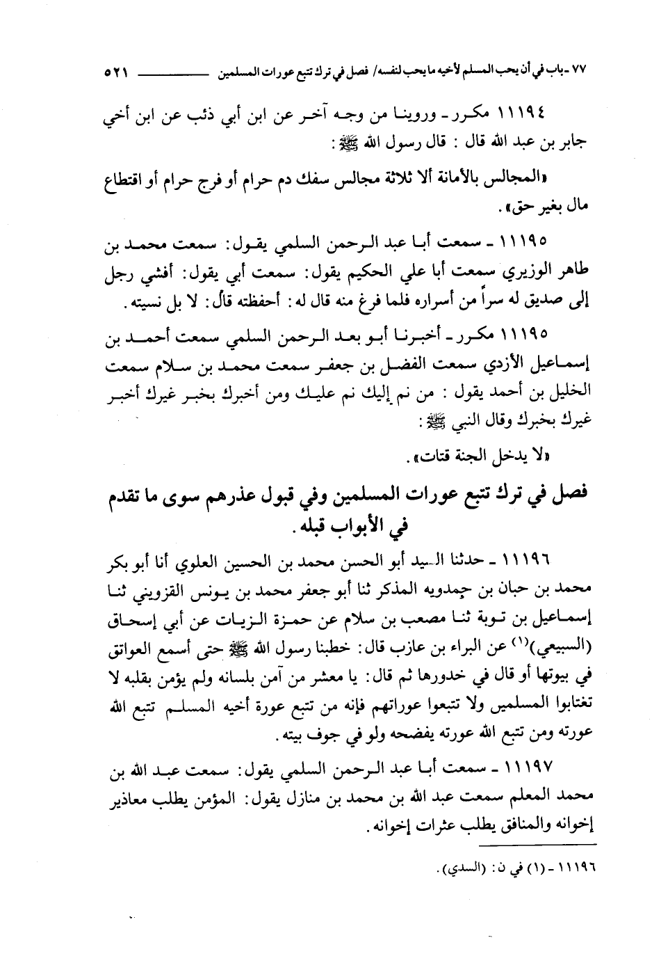 11195 - مكرر ـ أخبرنا أبو عبد الرحمن السلمي سمعت أحمد بن إسماعيل الأزدي سمعت الفضل بن جعفر سمعت محمد بن سلام سمعت الخليل بن أحمد يقول : من نم إليك نم عليك و من أخبرك بخبر غيرك أخبر غيرك بخبرك و قال النبي صلى الله عليه و سلم : لا يدخل الجنة قتات