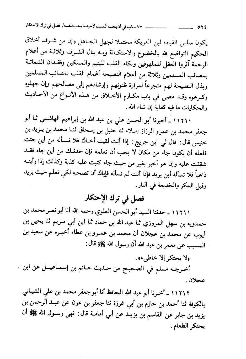11212 - أخبرنا أبو عبد الله الحافظ أنا أبو جعفر محمد بن علي الشيباني بالكوفة ثنا أحمد بن حازم بن أبي غرزة ثنا جعفر بن عون عن عبد الرحمن بن يزيد بن جابر عن القاسم بن يزيد عن أبي أمامة قال : نهى رسول الله صلى الله عليه و سلم أن يحتكر الطعام