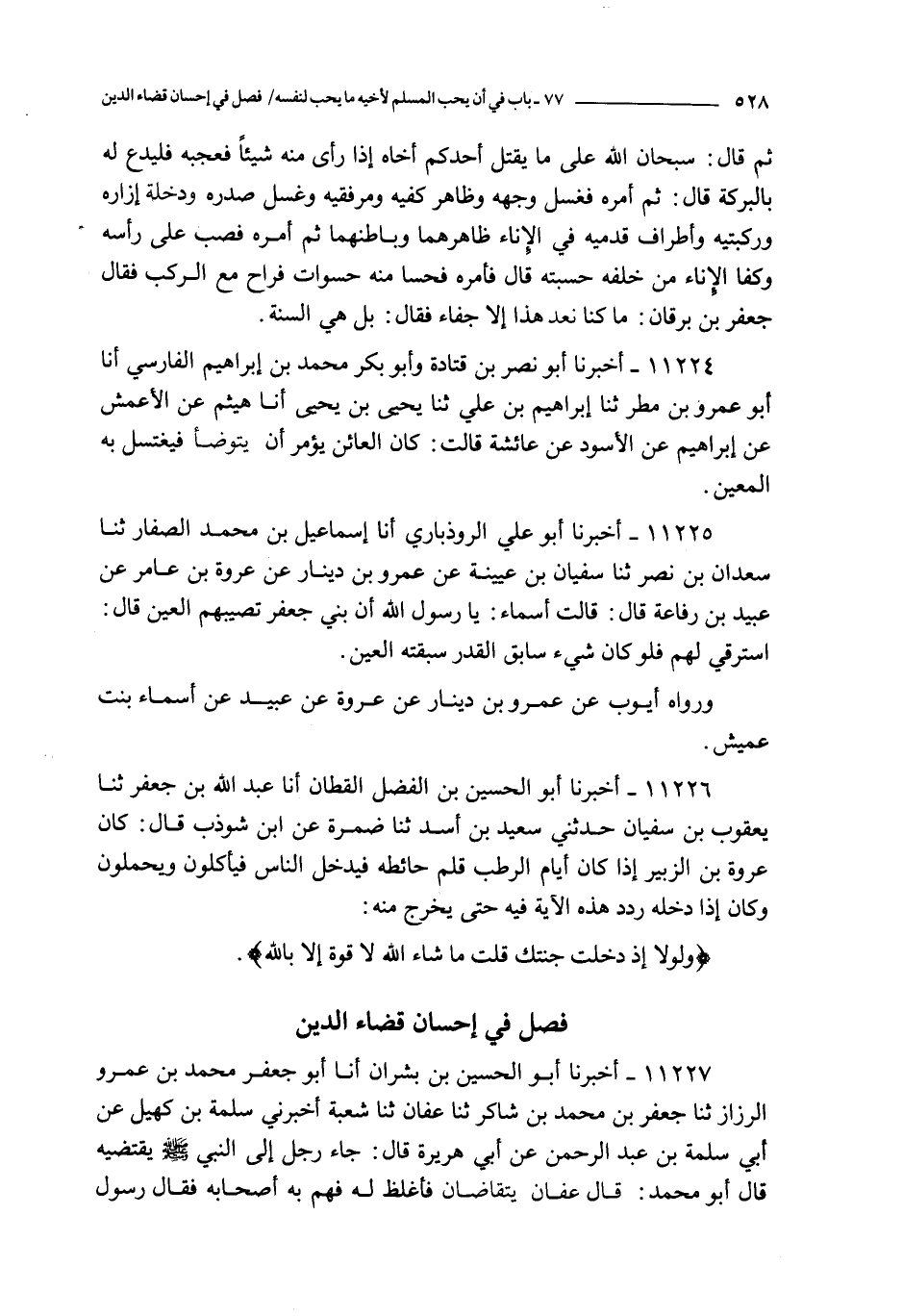 11225 - أخبرنا أبو علي الروذباري أنا إسماعيل بن محمد الصفار ثنا سعدان بن نصر ثنا سفيان بن عيينة عن عمرو بن دينار عن عروة بن عامر عن عبيد بن رفاعة قال : قالت أسماء : يا رسول الله إن بني جعفر تصيبهم العين قال : استرقي لهم فلو كان شيء سابق القدر سبقته العين