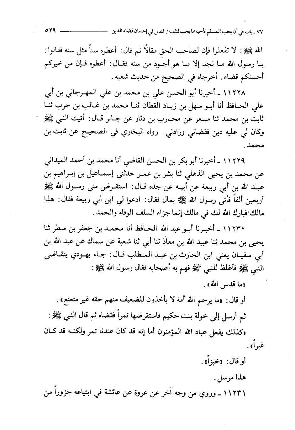 11231 - و روي من وجه آخر عن عروة : عن عائشة في ابتياعه جزورا من أعرابي بوسق من تمر و أنه لم يجده عنده فاستقرضه من خويلة و أوفاه لم يذكر كلمة التقديس فقال : إن لصاحب الحق مقالا و قال في آخر فقال الأعرابي : جزاك الله خيرا و بارك عليك فقد أوفيت و أطيت فقال رسول الله صلى الله عليه و سلم : أولئك خيار عباد الله يوم القيامة الموفون الطيبون