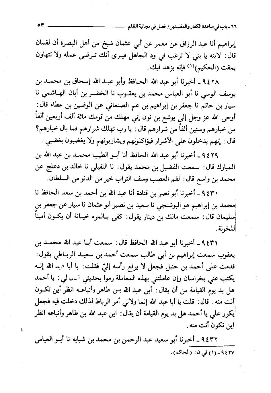 9432 - أخبرنا أبو سعيد عبد الرحمن بن محمد بن شبابه نا أبو العباس الفضل بن الفضل الكندي أنا عبد العزيز بن محمد بن الفضل الحارثي قرأه نا هارون بن العباس الهاشمي من ولد المنصور نا العلاء بن عمرو نا عبيد بن عمرو الرقي يقول : سمعت يونس بن عبيد يقول : سمعت الحسن يقول : من دعا لظالم بالبقاء فقد أحب أن يعصى الله عز و جل