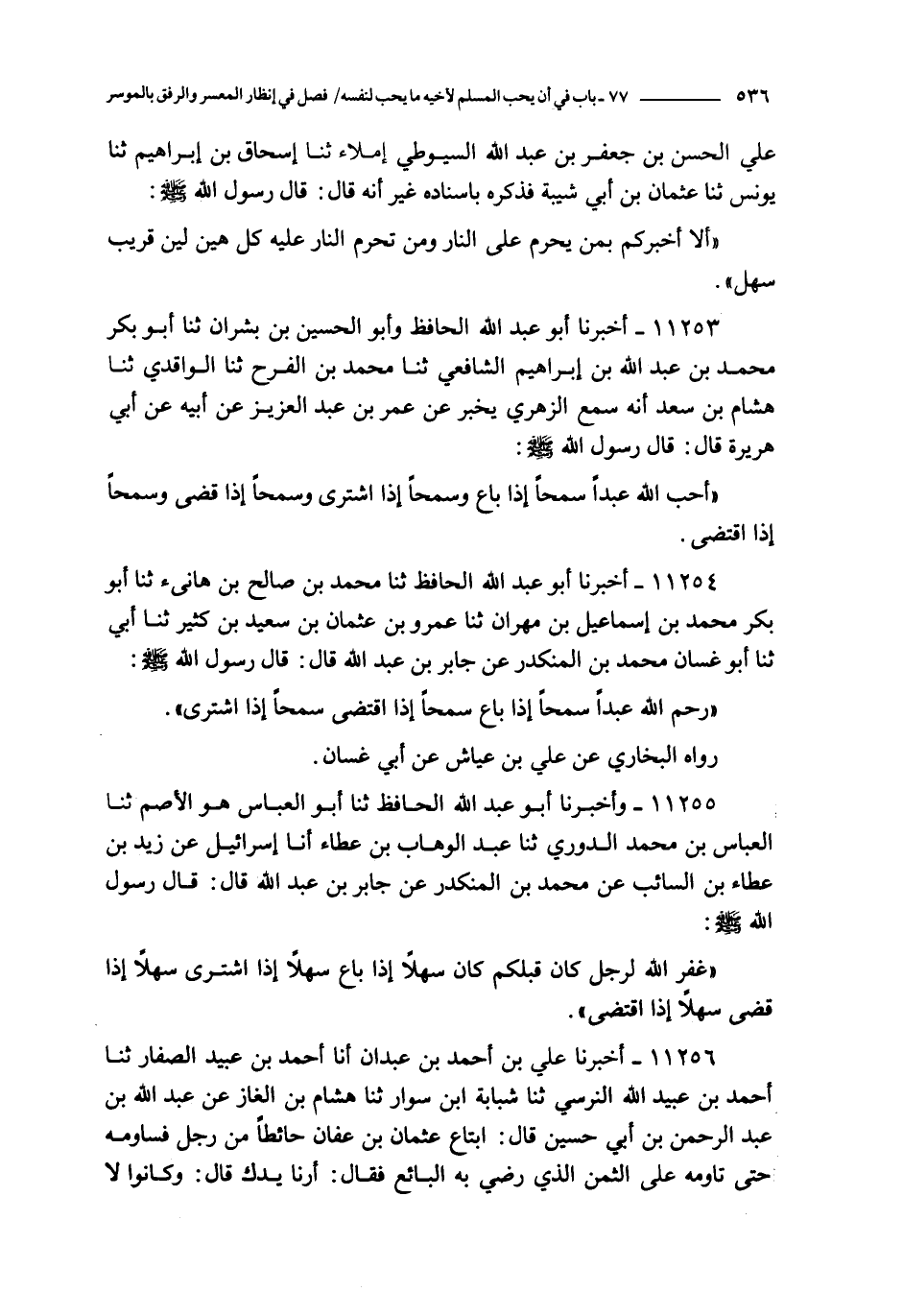 11256 - أخبرنا علي بن أحمد بن عبدان أنا أحمد بن عبيد الصفار ثنا أحمد بن عبيد الله النرسي ثنا شبابة بن سوار ثنا هشام بن الغاز عن عبد الله بن عبد الرحمن بن أبي حسين قال : ابتاع عثمان بن عفان حائطا من رجل فساومه حتى تاومه على الثمن الذي رضي به البائع فقال : أرنا يدك قال : و كانوا لا يستوجبون البيع إلا بالصفقة فلما رأى ذلك الرجل قال : لا أبيعك حتى تزيد لي عشرة آلاف فالتفت عثمان إلى عبد الرحمن بن عوف فقال : إني سمعت رسول الله صلى الله عليه و سلم يقول : إن الله عز و جل أدخل الجنة رجلا سمحا بائعا و مبتاعا و قاضيا و مقتضيا اذهب فقد زدتك هذه العشرة آلاف تستوجب لها بهذه الكلمة التي سمعتها من رسول الله صلى الله عليه و سلم
