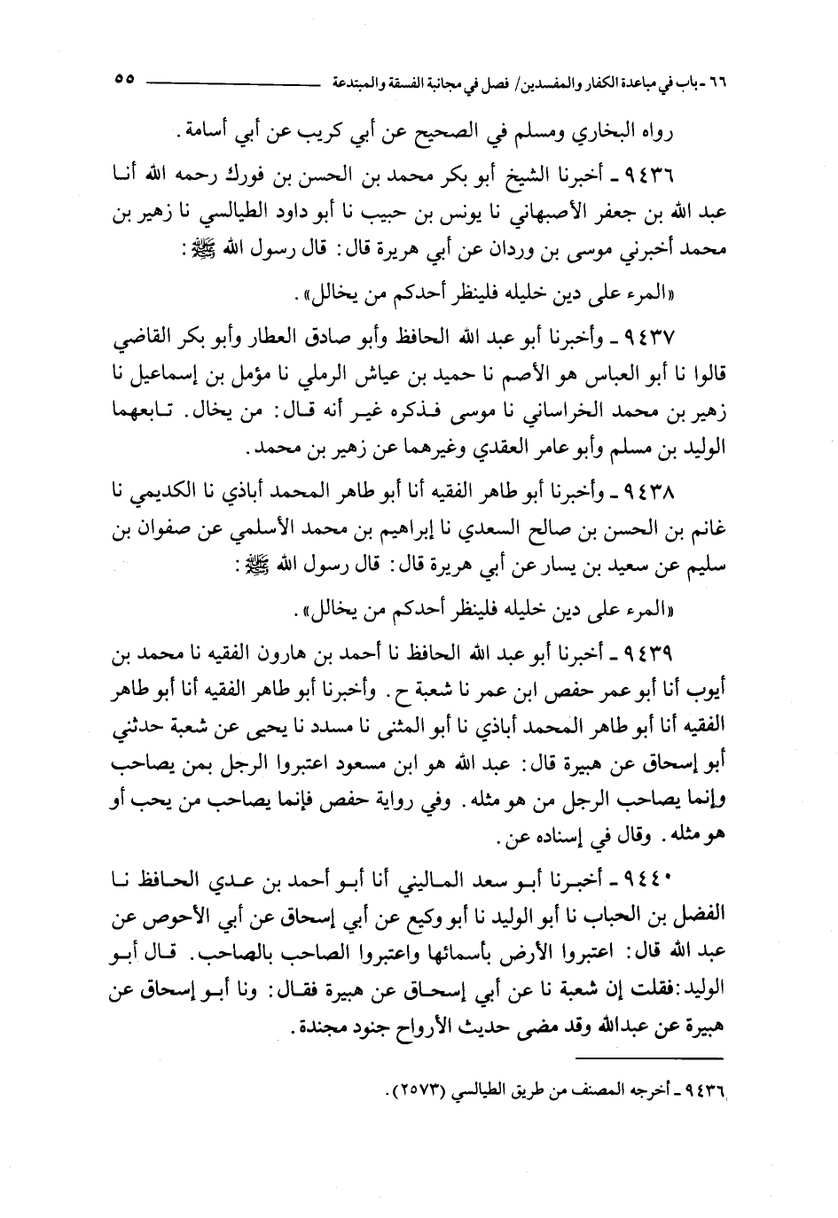 9436 - أخبرنا الشيخ أبو بكر محمد بن الحسن بن فورك رحمه الله أنا عبد الله بن جعفر الأصبهاني نا يونس بن حبيب نا أبو داود الطيالسي نا زهير بن محمد أخبرني موسى بن وردان عن أبي هريرة قال : قال رسول الله صلى الله عليه و سلم : المرء على دين خليله فلينظر أحدكم من يخالل