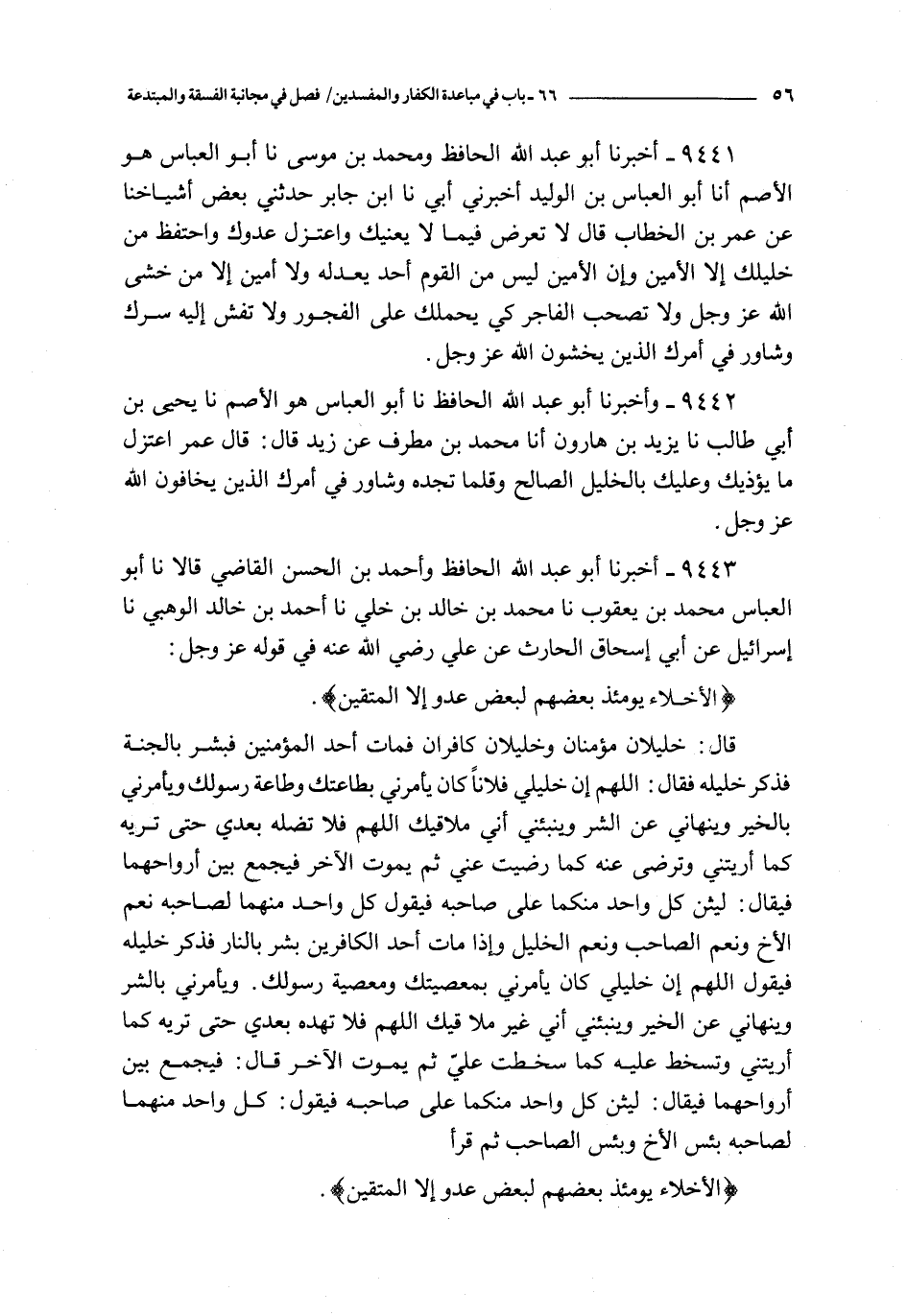 9441 - أخبرنا أبو عبد الله الحافظ و محمد بن موسى نا أبو العباس هو الأصم أنا أبو العباس بن الوليد أخبرني أبي نا ابن جابر حدثني بعض أشياخنا عن عمر بن الخطاب قال : لا تعرض فيما لا يعنيك و اعتزل عدوك و احتفظ من خليلك إلا الأمين و إن الأمين ليس من القوم أحد يعدله و لا أمين إلا من خشى الله عز و جل و لا تصحب الفاجر كي يحملك على الفجور و لا تفش إليه سرك و شاور في أمرك الذين يخشون الله عز و جل