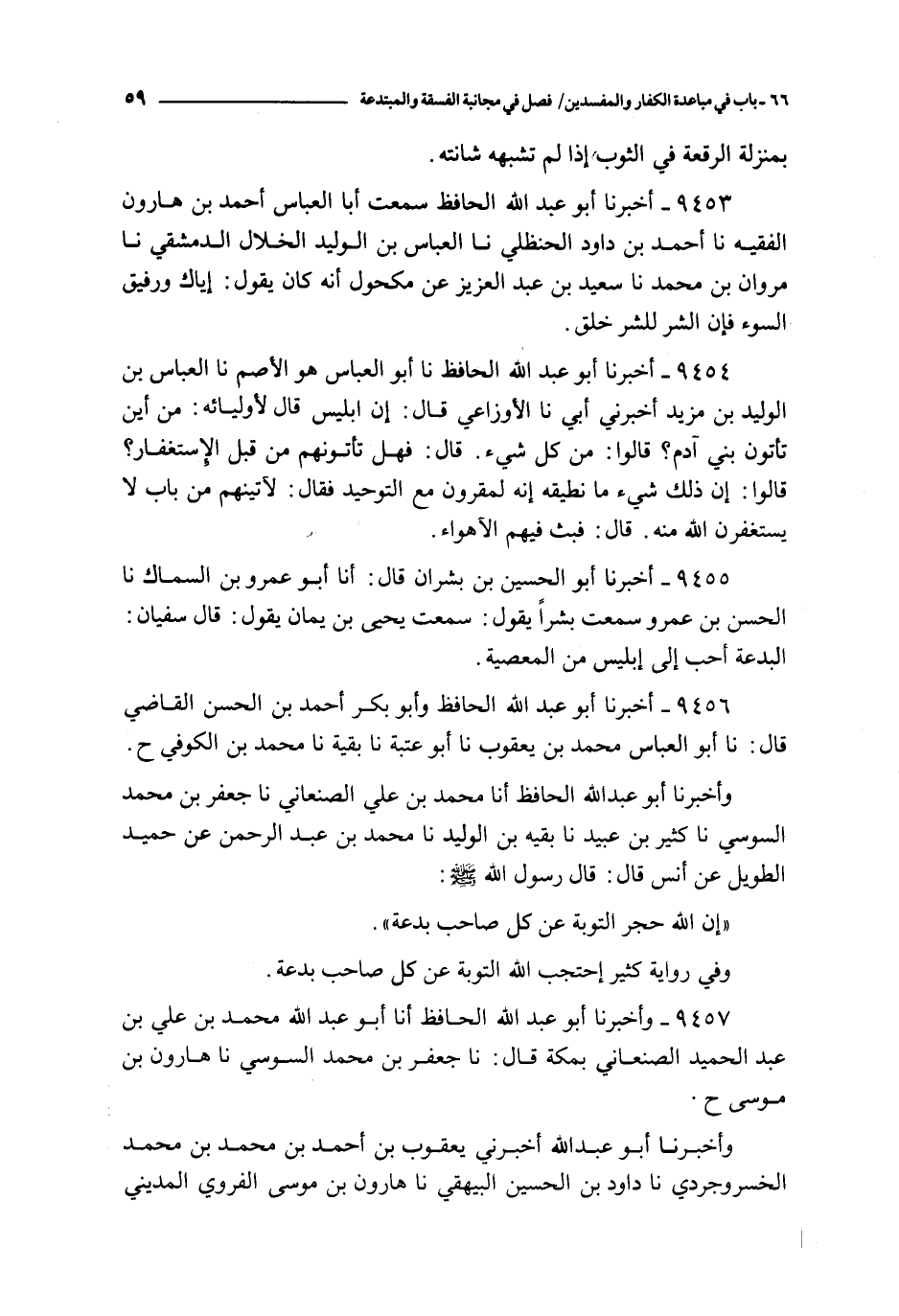 و أخبرنا أبو عبد الله الحافظ أنا محمد بن علي الصنعاني نا جعفر بن محمد السوسي نا كثير بن عبيد نا بقية بن الوليد نا محمد بن عبد الرحمن عن حميد الطويل عن أنس قال : قال رسول الله صلى الله عليه و سلم : إن الله حجر التوبة عن كل صاحب بدعة