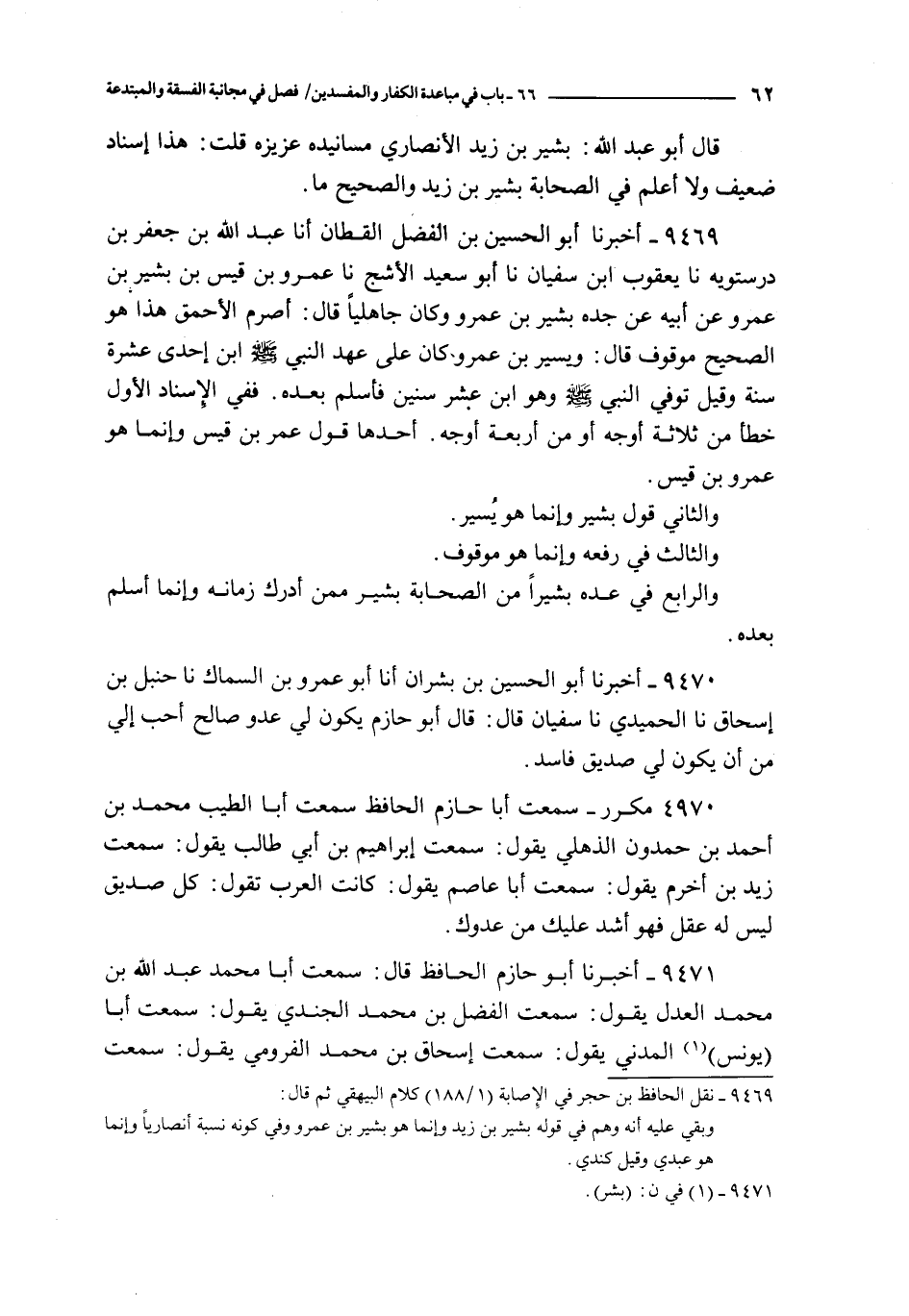 9469 - أخبرنا أبو الحسين بن الفضل القطان أنا عبد الله بن جعفر بن درستويه نا يعقوب بن سفيان نا أبو سعيد الأشج نا عمرو بن قيس بن بشير بن عمرو عن أبيه عن جده بشير بن عمرو و كان جاهليا قال : أصرم الأحمق هذا هو الصحيح موقوف قال : و يسير بن عمرو كان على عهد النبي صلى الله عليه و سلم ابن إحدى عشرة سنة و قيل توفي النبي صلى الله عليه و سلم و هو ابن عشر سنين فأسلم بعده ففي الإسناد الأول خطأ من ثلاثة أوجه أو من أربعة أوجه أحدها قول عمر بن قيس و إنما هو عمرو بن قيس