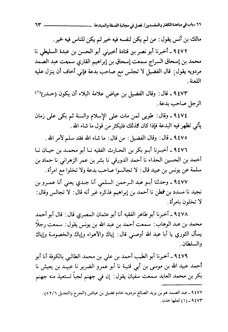 9472 - أخبرنا أبو نصر بن قتادة أخبرني أبو الحسن بن عبدة السليطي نا محمد بن إسحاق السراج سمعت إسحاق بن إبراهيم القاري سمعت عبد الصمد مردويه يقول : قال الفضيل لا تجلس مع صاحب بدعة فإني أخاف أن ينزل عليه اللعنة